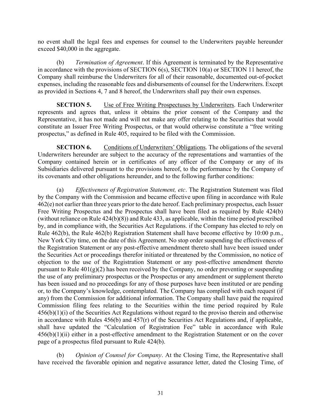 31 no event shall the legal fees and expenses for counsel to the Underwriters payable hereunder exceed $40,000 in the aggregate. (b) Termination of Agreement. If this Agreement is terminated by the Representative in accordance with the provisions of SECTION 6(s), SECTION 10(a) or SECTION 11 hereof, the Company shall reimburse the Underwriters for all of their reasonable, documented out-of-pocket expenses, including the reasonable fees and disbursements of counsel for the Underwriters. Except as provided in Sections 4, 7 and 8 hereof, the Underwriters shall pay their own expenses. SECTION 5. Use of Free Writing Prospectuses by Underwriters. Each Underwriter represents and agrees that, unless it obtains the prior consent of the Company and the Representative, it has not made and will not make any offer relating to the Securities that would constitute an Issuer Free Writing Prospectus, or that would otherwise constitute a “free writing prospectus,” as defined in Rule 405, required to be filed with the Commission. SECTION 6. Conditions of Underwriters’ Obligations. The obligations of the several Underwriters hereunder are subject to the accuracy of the representations and warranties of the Company contained herein or in certificates of any officer of the Company or any of its Subsidiaries delivered pursuant to the provisions hereof, to the performance by the Company of its covenants and other obligations hereunder, and to the following further conditions: (a) Effectiveness of Registration Statement, etc. The Registration Statement was filed by the Company with the Commission and became effective upon filing in accordance with Rule 462(e) not earlier than three years prior to the date hereof. Each preliminary prospectus, each Issuer Free Writing Prospectus and the Prospectus shall have been filed as required by Rule 424(b) (without reliance on Rule 424(b)(8)) and Rule 433, as applicable, within the time period prescribed by, and in compliance with, the Securities Act Regulations. if the Company has elected to rely on Rule 462(b), the Rule 462(b) Registration Statement shall have become effective by 10:00 p.m., New York City time, on the date of this Agreement. No stop order suspending the effectiveness of the Registration Statement or any post-effective amendment thereto shall have been issued under the Securities Act or proceedings therefor initiated or threatened by the Commission, no notice of objection to the use of the Registration Statement or any post-effective amendment thereto pursuant to Rule 401(g)(2) has been received by the Company, no order preventing or suspending the use of any preliminary prospectus or the Prospectus or any amendment or supplement thereto has been issued and no proceedings for any of those purposes have been instituted or are pending or, to the Company’s knowledge, contemplated. The Company has complied with each request (if any) from the Commission for additional information. The Company shall have paid the required Commission filing fees relating to the Securities within the time period required by Rule 456(b)(1)(i) of the Securities Act Regulations without regard to the proviso therein and otherwise in accordance with Rules 456(b) and 457(r) of the Securities Act Regulations and, if applicable, shall have updated the “Calculation of Registration Fee” table in accordance with Rule 456(b)(1)(ii) either in a post-effective amendment to the Registration Statement or on the cover page of a prospectus filed pursuant to Rule 424(b). (b) Opinion of Counsel for Company. At the Closing Time, the Representative shall have received the favorable opinion and negative assurance letter, dated the Closing Time, of