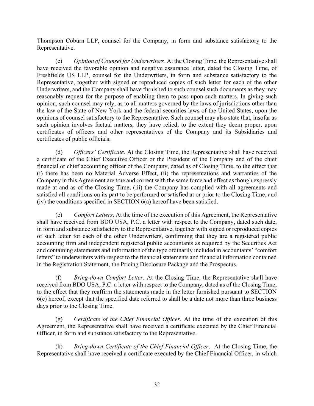 32 Thompson Coburn LLP, counsel for the Company, in form and substance satisfactory to the Representative. (c) Opinion of Counsel for Underwriters. At the Closing Time, the Representative shall have received the favorable opinion and negative assurance letter, dated the Closing Time, of Freshfields US LLP, counsel for the Underwriters, in form and substance satisfactory to the Representative, together with signed or reproduced copies of such letter for each of the other Underwriters, and the Company shall have furnished to such counsel such documents as they may reasonably request for the purpose of enabling them to pass upon such matters. In giving such opinion, such counsel may rely, as to all matters governed by the laws of jurisdictions other than the law of the State of New York and the federal securities laws of the United States, upon the opinions of counsel satisfactory to the Representative. Such counsel may also state that, insofar as such opinion involves factual matters, they have relied, to the extent they deem proper, upon certificates of officers and other representatives of the Company and its Subsidiaries and certificates of public officials. (d) Officers’ Certificate. At the Closing Time, the Representative shall have received a certificate of the Chief Executive Officer or the President of the Company and of the chief financial or chief accounting officer of the Company, dated as of Closing Time, to the effect that (i) there has been no Material Adverse Effect, (ii) the representations and warranties of the Company in this Agreement are true and correct with the same force and effect as though expressly made at and as of the Closing Time, (iii) the Company has complied with all agreements and satisfied all conditions on its part to be performed or satisfied at or prior to the Closing Time, and (iv) the conditions specified in SECTION 6(a) hereof have been satisfied. (e) Comfort Letters. At the time of the execution of this Agreement, the Representative shall have received from BDO USA, P.C. a letter with respect to the Company, dated such date, in form and substance satisfactory to the Representative, together with signed or reproduced copies of such letter for each of the other Underwriters, confirming that they are a registered public accounting firm and independent registered public accountants as required by the Securities Act and containing statements and information of the type ordinarily included in accountants’ “comfort letters” to underwriters with respect to the financial statements and financial information contained in the Registration Statement, the Pricing Disclosure Package and the Prospectus. (f) Bring-down Comfort Letter. At the Closing Time, the Representative shall have received from BDO USA, P.C. a letter with respect to the Company, dated as of the Closing Time, to the effect that they reaffirm the statements made in the letter furnished pursuant to SECTION 6(e) hereof, except that the specified date referred to shall be a date not more than three business days prior to the Closing Time. (g) Certificate of the Chief Financial Officer. At the time of the execution of this Agreement, the Representative shall have received a certificate executed by the Chief Financial Officer, in form and substance satisfactory to the Representative. (h) Bring-down Certificate of the Chief Financial Officer. At the Closing Time, the Representative shall have received a certificate executed by the Chief Financial Officer, in which
