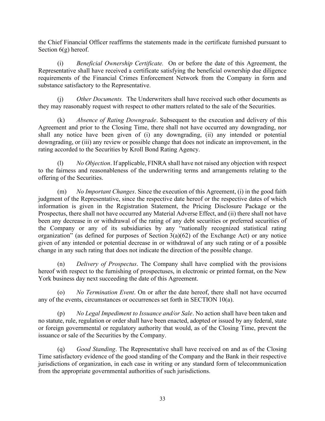 33 the Chief Financial Officer reaffirms the statements made in the certificate furnished pursuant to Section 6(g) hereof. (i) Beneficial Ownership Certificate. On or before the date of this Agreement, the Representative shall have received a certificate satisfying the beneficial ownership due diligence requirements of the Financial Crimes Enforcement Network from the Company in form and substance satisfactory to the Representative. (j) Other Documents. The Underwriters shall have received such other documents as they may reasonably request with respect to other matters related to the sale of the Securities. (k) Absence of Rating Downgrade. Subsequent to the execution and delivery of this Agreement and prior to the Closing Time, there shall not have occurred any downgrading, nor shall any notice have been given of (i) any downgrading, (ii) any intended or potential downgrading, or (iii) any review or possible change that does not indicate an improvement, in the rating accorded to the Securities by Kroll Bond Rating Agency. (l) No Objection. If applicable, FINRA shall have not raised any objection with respect to the fairness and reasonableness of the underwriting terms and arrangements relating to the offering of the Securities. (m) No Important Changes. Since the execution of this Agreement, (i) in the good faith judgment of the Representative, since the respective date hereof or the respective dates of which information is given in the Registration Statement, the Pricing Disclosure Package or the Prospectus, there shall not have occurred any Material Adverse Effect, and (ii) there shall not have been any decrease in or withdrawal of the rating of any debt securities or preferred securities of the Company or any of its subsidiaries by any “nationally recognized statistical rating organization” (as defined for purposes of Section 3(a)(62) of the Exchange Act) or any notice given of any intended or potential decrease in or withdrawal of any such rating or of a possible change in any such rating that does not indicate the direction of the possible change. (n) Delivery of Prospectus. The Company shall have complied with the provisions hereof with respect to the furnishing of prospectuses, in electronic or printed format, on the New York business day next succeeding the date of this Agreement. (o) No Termination Event. On or after the date hereof, there shall not have occurred any of the events, circumstances or occurrences set forth in SECTION 10(a). (p) No Legal Impediment to Issuance and/or Sale. No action shall have been taken and no statute, rule, regulation or order shall have been enacted, adopted or issued by any federal, state or foreign governmental or regulatory authority that would, as of the Closing Time, prevent the issuance or sale of the Securities by the Company. (q) Good Standing. The Representative shall have received on and as of the Closing Time satisfactory evidence of the good standing of the Company and the Bank in their respective jurisdictions of organization, in each case in writing or any standard form of telecommunication from the appropriate governmental authorities of such jurisdictions.