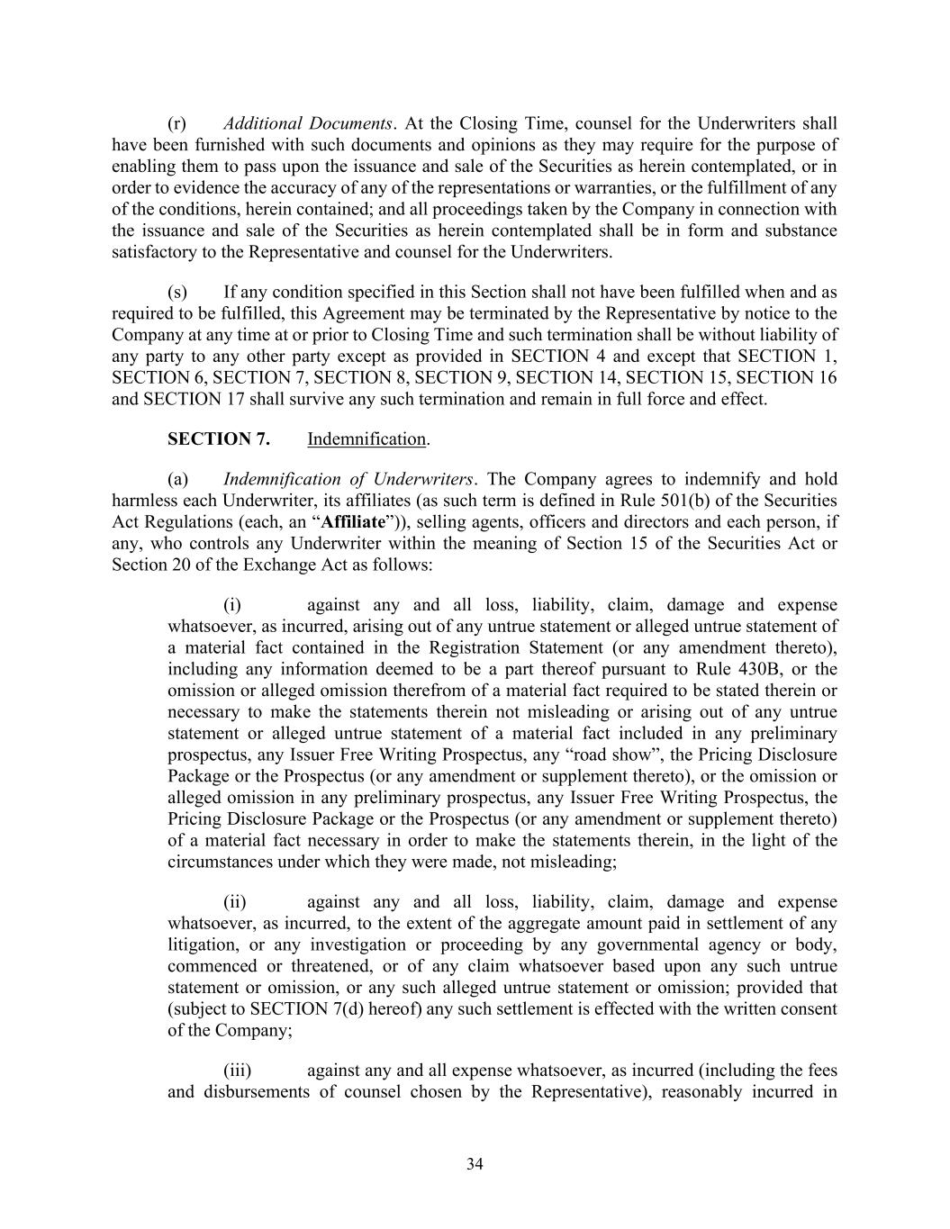 34 (r) Additional Documents. At the Closing Time, counsel for the Underwriters shall have been furnished with such documents and opinions as they may require for the purpose of enabling them to pass upon the issuance and sale of the Securities as herein contemplated, or in order to evidence the accuracy of any of the representations or warranties, or the fulfillment of any of the conditions, herein contained; and all proceedings taken by the Company in connection with the issuance and sale of the Securities as herein contemplated shall be in form and substance satisfactory to the Representative and counsel for the Underwriters. (s) If any condition specified in this Section shall not have been fulfilled when and as required to be fulfilled, this Agreement may be terminated by the Representative by notice to the Company at any time at or prior to Closing Time and such termination shall be without liability of any party to any other party except as provided in SECTION 4 and except that SECTION 1, SECTION 6, SECTION 7, SECTION 8, SECTION 9, SECTION 14, SECTION 15, SECTION 16 and SECTION 17 shall survive any such termination and remain in full force and effect. SECTION 7. Indemnification. (a) Indemnification of Underwriters. The Company agrees to indemnify and hold harmless each Underwriter, its affiliates (as such term is defined in Rule 501(b) of the Securities Act Regulations (each, an “Affiliate”)), selling agents, officers and directors and each person, if any, who controls any Underwriter within the meaning of Section 15 of the Securities Act or Section 20 of the Exchange Act as follows: (i) against any and all loss, liability, claim, damage and expense whatsoever, as incurred, arising out of any untrue statement or alleged untrue statement of a material fact contained in the Registration Statement (or any amendment thereto), including any information deemed to be a part thereof pursuant to Rule 430B, or the omission or alleged omission therefrom of a material fact required to be stated therein or necessary to make the statements therein not misleading or arising out of any untrue statement or alleged untrue statement of a material fact included in any preliminary prospectus, any Issuer Free Writing Prospectus, any “road show”, the Pricing Disclosure Package or the Prospectus (or any amendment or supplement thereto), or the omission or alleged omission in any preliminary prospectus, any Issuer Free Writing Prospectus, the Pricing Disclosure Package or the Prospectus (or any amendment or supplement thereto) of a material fact necessary in order to make the statements therein, in the light of the circumstances under which they were made, not misleading; (ii) against any and all loss, liability, claim, damage and expense whatsoever, as incurred, to the extent of the aggregate amount paid in settlement of any litigation, or any investigation or proceeding by any governmental agency or body, commenced or threatened, or of any claim whatsoever based upon any such untrue statement or omission, or any such alleged untrue statement or omission; provided that (subject to SECTION 7(d) hereof) any such settlement is effected with the written consent of the Company; (iii) against any and all expense whatsoever, as incurred (including the fees and disbursements of counsel chosen by the Representative), reasonably incurred in