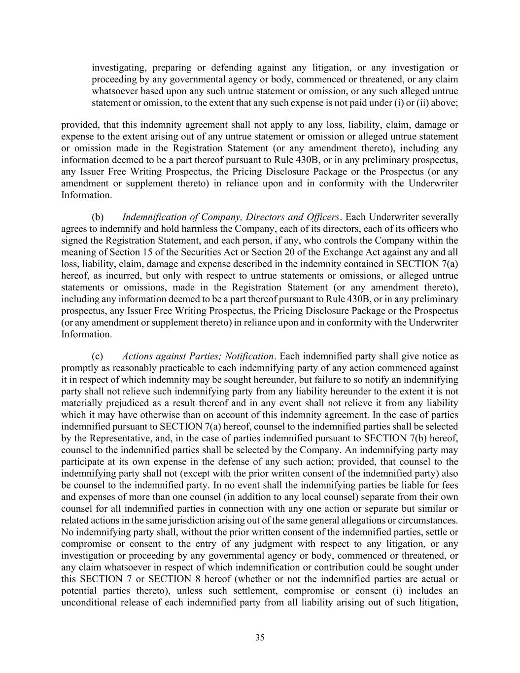 35 investigating, preparing or defending against any litigation, or any investigation or proceeding by any governmental agency or body, commenced or threatened, or any claim whatsoever based upon any such untrue statement or omission, or any such alleged untrue statement or omission, to the extent that any such expense is not paid under (i) or (ii) above; provided, that this indemnity agreement shall not apply to any loss, liability, claim, damage or expense to the extent arising out of any untrue statement or omission or alleged untrue statement or omission made in the Registration Statement (or any amendment thereto), including any information deemed to be a part thereof pursuant to Rule 430B, or in any preliminary prospectus, any Issuer Free Writing Prospectus, the Pricing Disclosure Package or the Prospectus (or any amendment or supplement thereto) in reliance upon and in conformity with the Underwriter Information. (b) Indemnification of Company, Directors and Officers. Each Underwriter severally agrees to indemnify and hold harmless the Company, each of its directors, each of its officers who signed the Registration Statement, and each person, if any, who controls the Company within the meaning of Section 15 of the Securities Act or Section 20 of the Exchange Act against any and all loss, liability, claim, damage and expense described in the indemnity contained in SECTION 7(a) hereof, as incurred, but only with respect to untrue statements or omissions, or alleged untrue statements or omissions, made in the Registration Statement (or any amendment thereto), including any information deemed to be a part thereof pursuant to Rule 430B, or in any preliminary prospectus, any Issuer Free Writing Prospectus, the Pricing Disclosure Package or the Prospectus (or any amendment or supplement thereto) in reliance upon and in conformity with the Underwriter Information. (c) Actions against Parties; Notification. Each indemnified party shall give notice as promptly as reasonably practicable to each indemnifying party of any action commenced against it in respect of which indemnity may be sought hereunder, but failure to so notify an indemnifying party shall not relieve such indemnifying party from any liability hereunder to the extent it is not materially prejudiced as a result thereof and in any event shall not relieve it from any liability which it may have otherwise than on account of this indemnity agreement. In the case of parties indemnified pursuant to SECTION 7(a) hereof, counsel to the indemnified parties shall be selected by the Representative, and, in the case of parties indemnified pursuant to SECTION 7(b) hereof, counsel to the indemnified parties shall be selected by the Company. An indemnifying party may participate at its own expense in the defense of any such action; provided, that counsel to the indemnifying party shall not (except with the prior written consent of the indemnified party) also be counsel to the indemnified party. In no event shall the indemnifying parties be liable for fees and expenses of more than one counsel (in addition to any local counsel) separate from their own counsel for all indemnified parties in connection with any one action or separate but similar or related actions in the same jurisdiction arising out of the same general allegations or circumstances. No indemnifying party shall, without the prior written consent of the indemnified parties, settle or compromise or consent to the entry of any judgment with respect to any litigation, or any investigation or proceeding by any governmental agency or body, commenced or threatened, or any claim whatsoever in respect of which indemnification or contribution could be sought under this SECTION 7 or SECTION 8 hereof (whether or not the indemnified parties are actual or potential parties thereto), unless such settlement, compromise or consent (i) includes an unconditional release of each indemnified party from all liability arising out of such litigation,