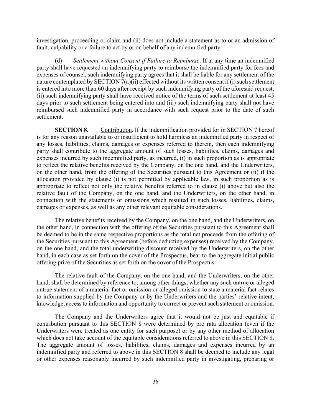 36 investigation, proceeding or claim and (ii) does not include a statement as to or an admission of fault, culpability or a failure to act by or on behalf of any indemnified party. (d) Settlement without Consent if Failure to Reimburse. If at any time an indemnified party shall have requested an indemnifying party to reimburse the indemnified party for fees and expenses of counsel, such indemnifying party agrees that it shall be liable for any settlement of the nature contemplated by SECTION 7(a)(ii) effected without its written consent if (i) such settlement is entered into more than 60 days after receipt by such indemnifying party of the aforesaid request, (ii) such indemnifying party shall have received notice of the terms of such settlement at least 45 days prior to such settlement being entered into and (iii) such indemnifying party shall not have reimbursed such indemnified party in accordance with such request prior to the date of such settlement. SECTION 8. Contribution. If the indemnification provided for in SECTION 7 hereof is for any reason unavailable to or insufficient to hold harmless an indemnified party in respect of any losses, liabilities, claims, damages or expenses referred to therein, then each indemnifying party shall contribute to the aggregate amount of such losses, liabilities, claims, damages and expenses incurred by such indemnified party, as incurred, (i) in such proportion as is appropriate to reflect the relative benefits received by the Company, on the one hand, and the Underwriters, on the other hand, from the offering of the Securities pursuant to this Agreement or (ii) if the allocation provided by clause (i) is not permitted by applicable law, in such proportion as is appropriate to reflect not only the relative benefits referred to in clause (i) above but also the relative fault of the Company, on the one hand, and the Underwriters, on the other hand, in connection with the statements or omissions which resulted in such losses, liabilities, claims, damages or expenses, as well as any other relevant equitable considerations. The relative benefits received by the Company, on the one hand, and the Underwriters, on the other hand, in connection with the offering of the Securities pursuant to this Agreement shall be deemed to be in the same respective proportions as the total net proceeds from the offering of the Securities pursuant to this Agreement (before deducting expenses) received by the Company, on the one hand, and the total underwriting discount received by the Underwriters, on the other hand, in each case as set forth on the cover of the Prospectus, bear to the aggregate initial public offering price of the Securities as set forth on the cover of the Prospectus. The relative fault of the Company, on the one hand, and the Underwriters, on the other hand, shall be determined by reference to, among other things, whether any such untrue or alleged untrue statement of a material fact or omission or alleged omission to state a material fact relates to information supplied by the Company or by the Underwriters and the parties’ relative intent, knowledge, access to information and opportunity to correct or prevent such statement or omission. The Company and the Underwriters agree that it would not be just and equitable if contribution pursuant to this SECTION 8 were determined by pro rata allocation (even if the Underwriters were treated as one entity for such purpose) or by any other method of allocation which does not take account of the equitable considerations referred to above in this SECTION 8. The aggregate amount of losses, liabilities, claims, damages and expenses incurred by an indemnified party and referred to above in this SECTION 8 shall be deemed to include any legal or other expenses reasonably incurred by such indemnified party in investigating, preparing or