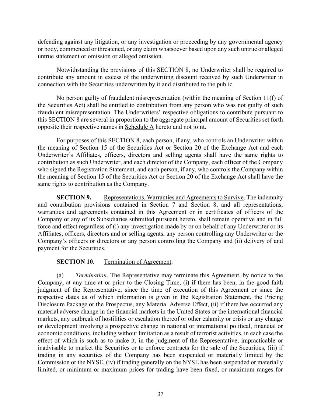 37 defending against any litigation, or any investigation or proceeding by any governmental agency or body, commenced or threatened, or any claim whatsoever based upon any such untrue or alleged untrue statement or omission or alleged omission. Notwithstanding the provisions of this SECTION 8, no Underwriter shall be required to contribute any amount in excess of the underwriting discount received by such Underwriter in connection with the Securities underwritten by it and distributed to the public. No person guilty of fraudulent misrepresentation (within the meaning of Section 11(f) of the Securities Act) shall be entitled to contribution from any person who was not guilty of such fraudulent misrepresentation. The Underwriters’ respective obligations to contribute pursuant to this SECTION 8 are several in proportion to the aggregate principal amount of Securities set forth opposite their respective names in Schedule A hereto and not joint. For purposes of this SECTION 8, each person, if any, who controls an Underwriter within the meaning of Section 15 of the Securities Act or Section 20 of the Exchange Act and each Underwriter’s Affiliates, officers, directors and selling agents shall have the same rights to contribution as such Underwriter, and each director of the Company, each officer of the Company who signed the Registration Statement, and each person, if any, who controls the Company within the meaning of Section 15 of the Securities Act or Section 20 of the Exchange Act shall have the same rights to contribution as the Company. SECTION 9. Representations, Warranties and Agreements to Survive. The indemnity and contribution provisions contained in Section 7 and Section 8, and all representations, warranties and agreements contained in this Agreement or in certificates of officers of the Company or any of its Subsidiaries submitted pursuant hereto, shall remain operative and in full force and effect regardless of (i) any investigation made by or on behalf of any Underwriter or its Affiliates, officers, directors and or selling agents, any person controlling any Underwriter or the Company’s officers or directors or any person controlling the Company and (ii) delivery of and payment for the Securities. SECTION 10. Termination of Agreement. (a) Termination. The Representative may terminate this Agreement, by notice to the Company, at any time at or prior to the Closing Time, (i) if there has been, in the good faith judgment of the Representative, since the time of execution of this Agreement or since the respective dates as of which information is given in the Registration Statement, the Pricing Disclosure Package or the Prospectus, any Material Adverse Effect, (ii) if there has occurred any material adverse change in the financial markets in the United States or the international financial markets, any outbreak of hostilities or escalation thereof or other calamity or crisis or any change or development involving a prospective change in national or international political, financial or economic conditions, including without limitation as a result of terrorist activities, in each case the effect of which is such as to make it, in the judgment of the Representative, impracticable or inadvisable to market the Securities or to enforce contracts for the sale of the Securities, (iii) if trading in any securities of the Company has been suspended or materially limited by the Commission or the NYSE, (iv) if trading generally on the NYSE has been suspended or materially limited, or minimum or maximum prices for trading have been fixed, or maximum ranges for