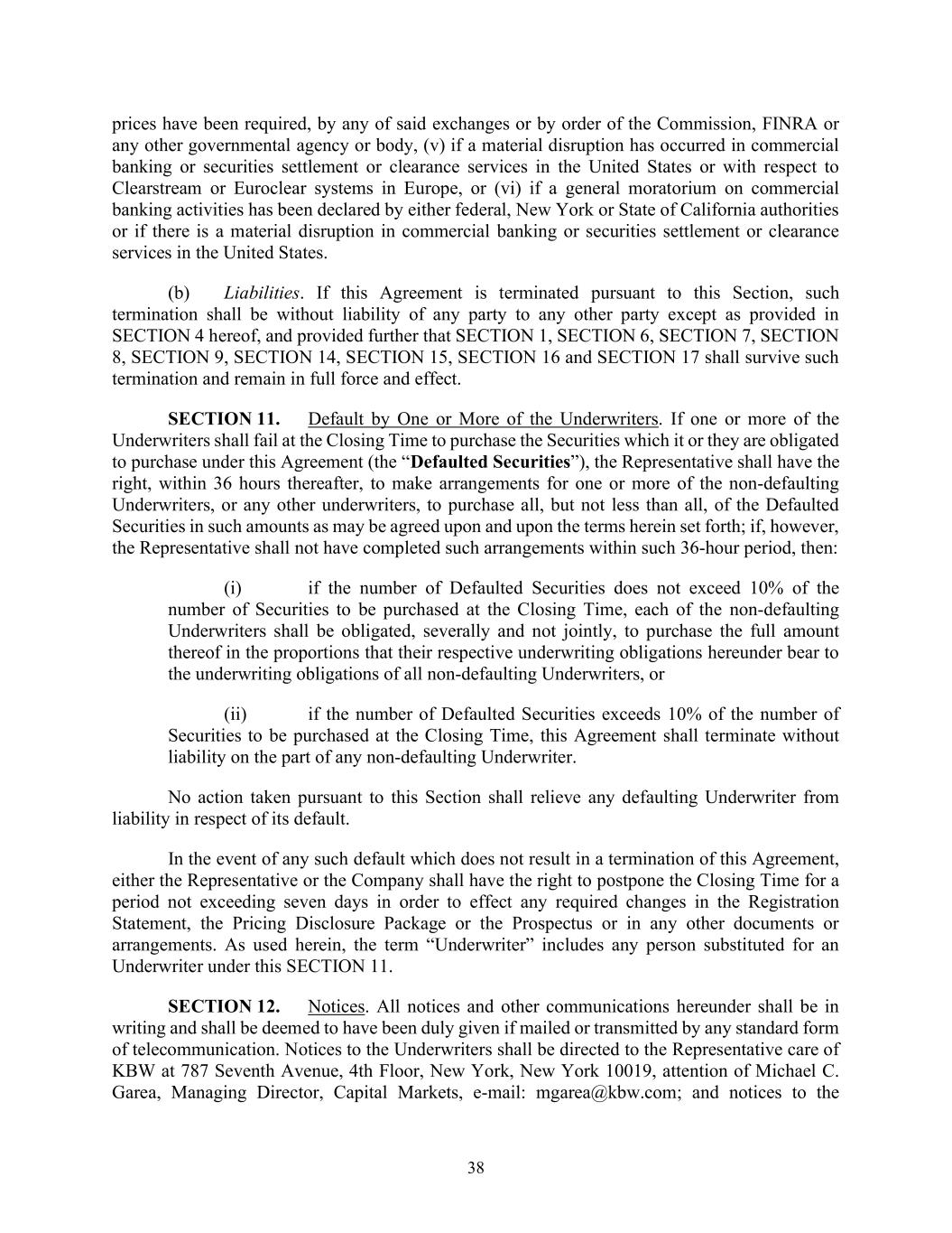 38 prices have been required, by any of said exchanges or by order of the Commission, FINRA or any other governmental agency or body, (v) if a material disruption has occurred in commercial banking or securities settlement or clearance services in the United States or with respect to Clearstream or Euroclear systems in Europe, or (vi) if a general moratorium on commercial banking activities has been declared by either federal, New York or State of California authorities or if there is a material disruption in commercial banking or securities settlement or clearance services in the United States. (b) Liabilities. If this Agreement is terminated pursuant to this Section, such termination shall be without liability of any party to any other party except as provided in SECTION 4 hereof, and provided further that SECTION 1, SECTION 6, SECTION 7, SECTION 8, SECTION 9, SECTION 14, SECTION 15, SECTION 16 and SECTION 17 shall survive such termination and remain in full force and effect. SECTION 11. Default by One or More of the Underwriters. If one or more of the Underwriters shall fail at the Closing Time to purchase the Securities which it or they are obligated to purchase under this Agreement (the “Defaulted Securities”), the Representative shall have the right, within 36 hours thereafter, to make arrangements for one or more of the non-defaulting Underwriters, or any other underwriters, to purchase all, but not less than all, of the Defaulted Securities in such amounts as may be agreed upon and upon the terms herein set forth; if, however, the Representative shall not have completed such arrangements within such 36-hour period, then: (i) if the number of Defaulted Securities does not exceed 10% of the number of Securities to be purchased at the Closing Time, each of the non-defaulting Underwriters shall be obligated, severally and not jointly, to purchase the full amount thereof in the proportions that their respective underwriting obligations hereunder bear to the underwriting obligations of all non-defaulting Underwriters, or (ii) if the number of Defaulted Securities exceeds 10% of the number of Securities to be purchased at the Closing Time, this Agreement shall terminate without liability on the part of any non-defaulting Underwriter. No action taken pursuant to this Section shall relieve any defaulting Underwriter from liability in respect of its default. In the event of any such default which does not result in a termination of this Agreement, either the Representative or the Company shall have the right to postpone the Closing Time for a period not exceeding seven days in order to effect any required changes in the Registration Statement, the Pricing Disclosure Package or the Prospectus or in any other documents or arrangements. As used herein, the term “Underwriter” includes any person substituted for an Underwriter under this SECTION 11. SECTION 12. Notices. All notices and other communications hereunder shall be in writing and shall be deemed to have been duly given if mailed or transmitted by any standard form of telecommunication. Notices to the Underwriters shall be directed to the Representative care of KBW at 787 Seventh Avenue, 4th Floor, New York, New York 10019, attention of Michael C. Garea, Managing Director, Capital Markets, e-mail: mgarea@kbw.com; and notices to the