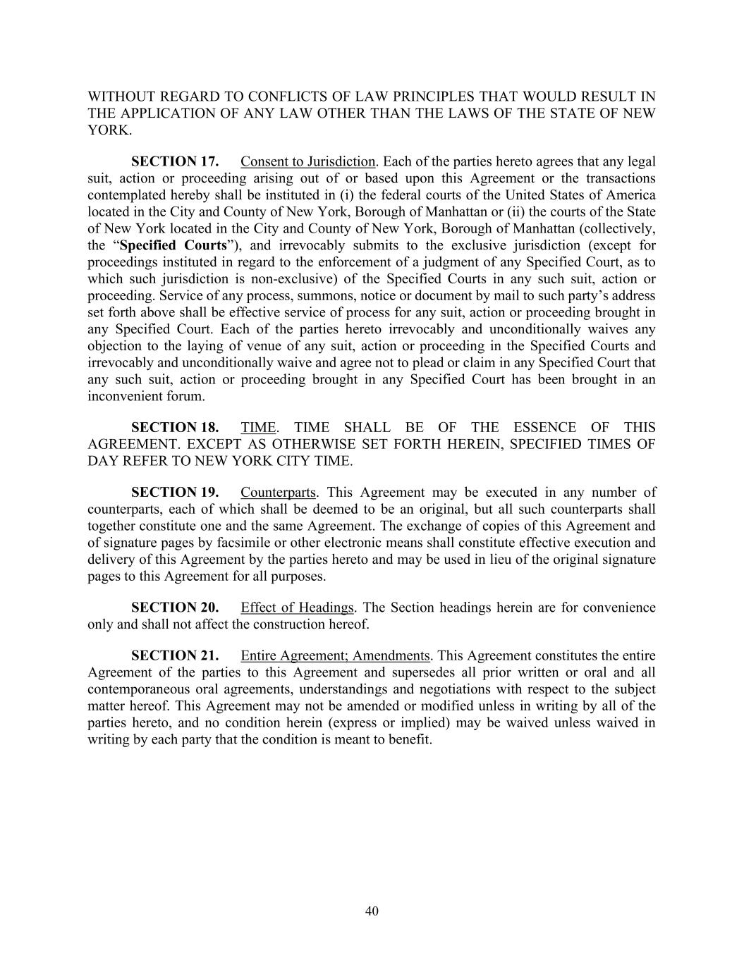 40 WITHOUT REGARD TO CONFLICTS OF LAW PRINCIPLES THAT WOULD RESULT IN THE APPLICATION OF ANY LAW OTHER THAN THE LAWS OF THE STATE OF NEW YORK. SECTION 17. Consent to Jurisdiction. Each of the parties hereto agrees that any legal suit, action or proceeding arising out of or based upon this Agreement or the transactions contemplated hereby shall be instituted in (i) the federal courts of the United States of America located in the City and County of New York, Borough of Manhattan or (ii) the courts of the State of New York located in the City and County of New York, Borough of Manhattan (collectively, the “Specified Courts”), and irrevocably submits to the exclusive jurisdiction (except for proceedings instituted in regard to the enforcement of a judgment of any Specified Court, as to which such jurisdiction is non-exclusive) of the Specified Courts in any such suit, action or proceeding. Service of any process, summons, notice or document by mail to such party’s address set forth above shall be effective service of process for any suit, action or proceeding brought in any Specified Court. Each of the parties hereto irrevocably and unconditionally waives any objection to the laying of venue of any suit, action or proceeding in the Specified Courts and irrevocably and unconditionally waive and agree not to plead or claim in any Specified Court that any such suit, action or proceeding brought in any Specified Court has been brought in an inconvenient forum. SECTION 18. TIME. TIME SHALL BE OF THE ESSENCE OF THIS AGREEMENT. EXCEPT AS OTHERWISE SET FORTH HEREIN, SPECIFIED TIMES OF DAY REFER TO NEW YORK CITY TIME. SECTION 19. Counterparts. This Agreement may be executed in any number of counterparts, each of which shall be deemed to be an original, but all such counterparts shall together constitute one and the same Agreement. The exchange of copies of this Agreement and of signature pages by facsimile or other electronic means shall constitute effective execution and delivery of this Agreement by the parties hereto and may be used in lieu of the original signature pages to this Agreement for all purposes. SECTION 20. Effect of Headings. The Section headings herein are for convenience only and shall not affect the construction hereof. SECTION 21. Entire Agreement; Amendments. This Agreement constitutes the entire Agreement of the parties to this Agreement and supersedes all prior written or oral and all contemporaneous oral agreements, understandings and negotiations with respect to the subject matter hereof. This Agreement may not be amended or modified unless in writing by all of the parties hereto, and no condition herein (express or implied) may be waived unless waived in writing by each party that the condition is meant to benefit.