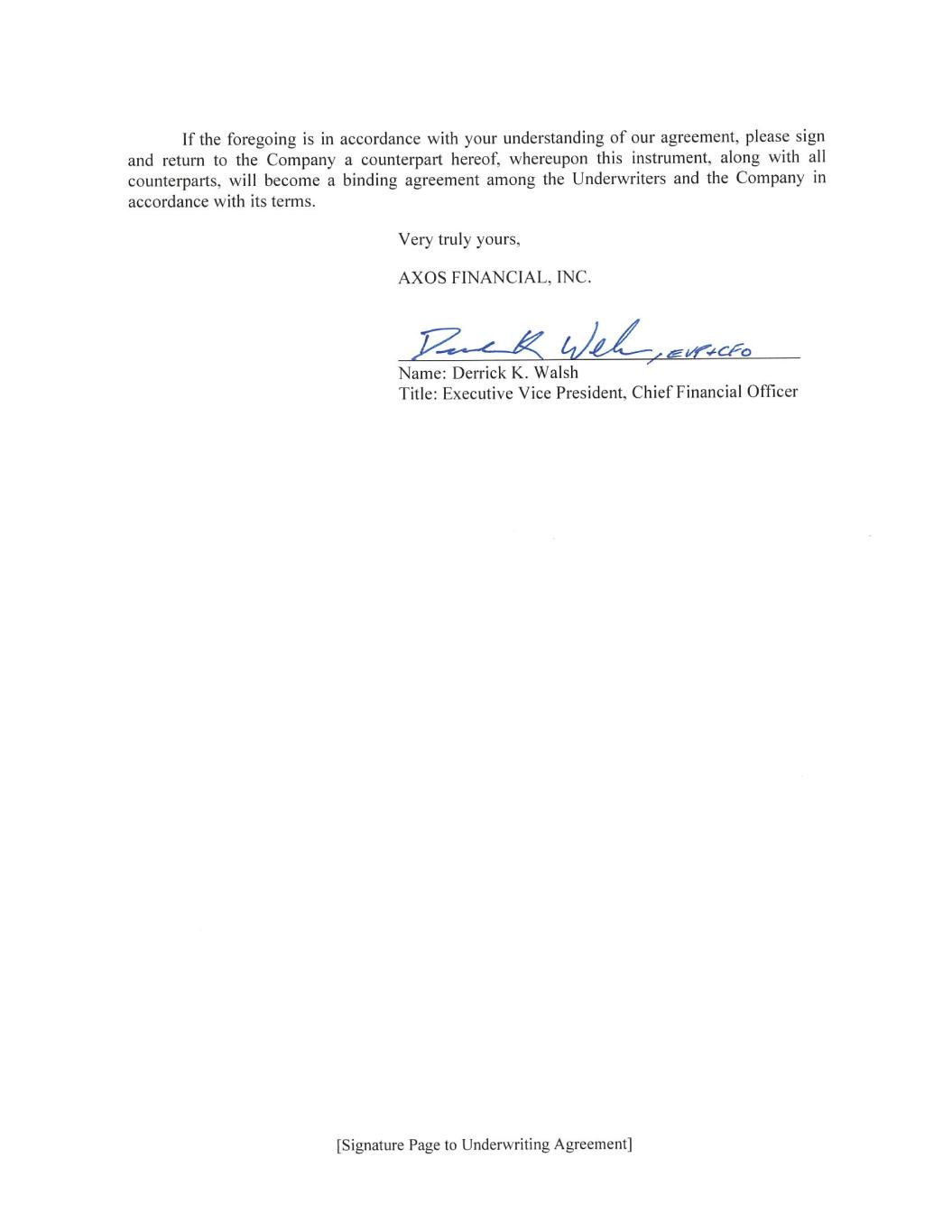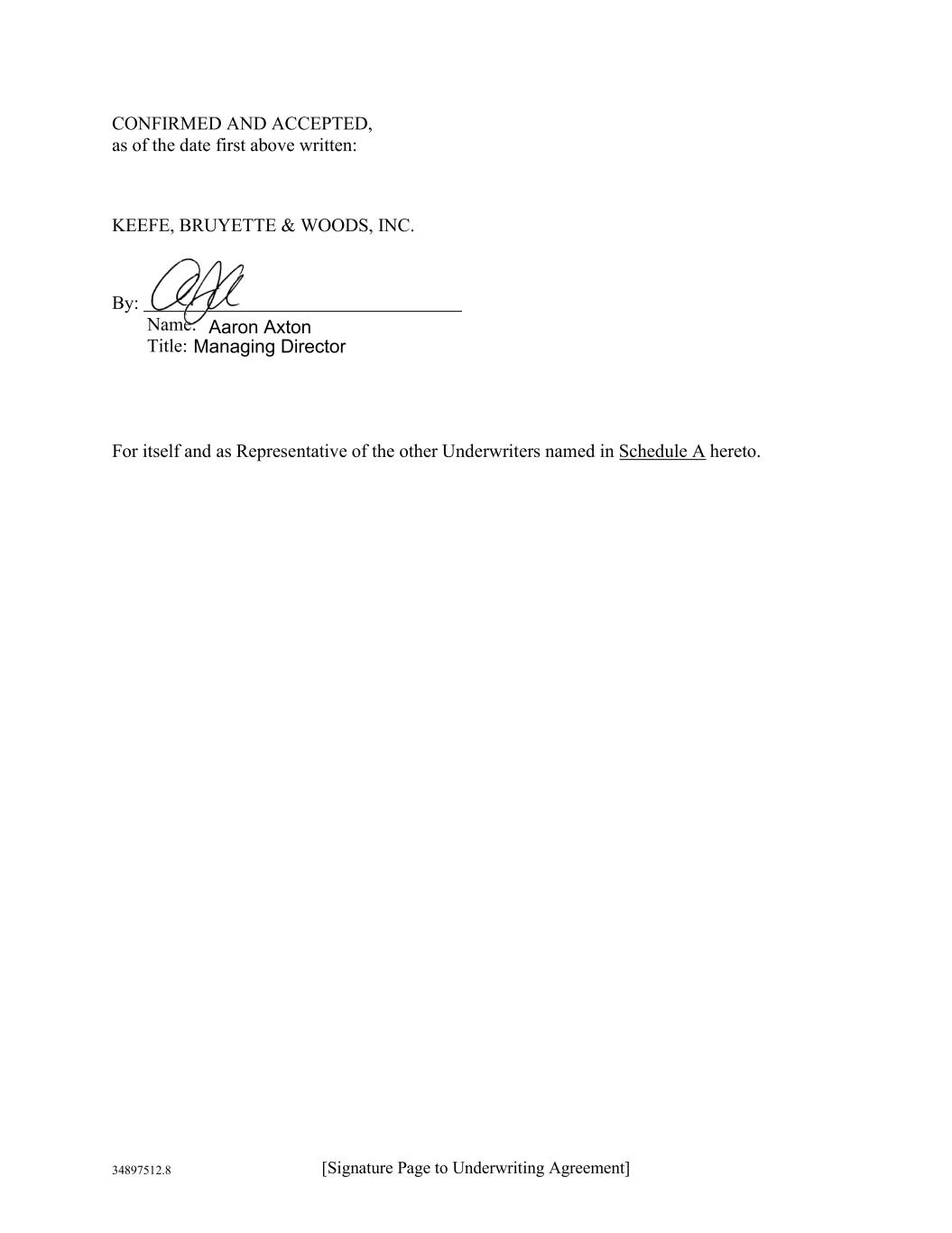 [Signature Page to Underwriting Agreement] 34897512.8 CONFIRMED AND ACCEPTED, as of the date first above written: KEEFE, BRUYETTE & WOODS, INC. By: Name: Title: For itself and as Representative of the other Underwriters named in Schedule A hereto. Aaron Axton Managing Director