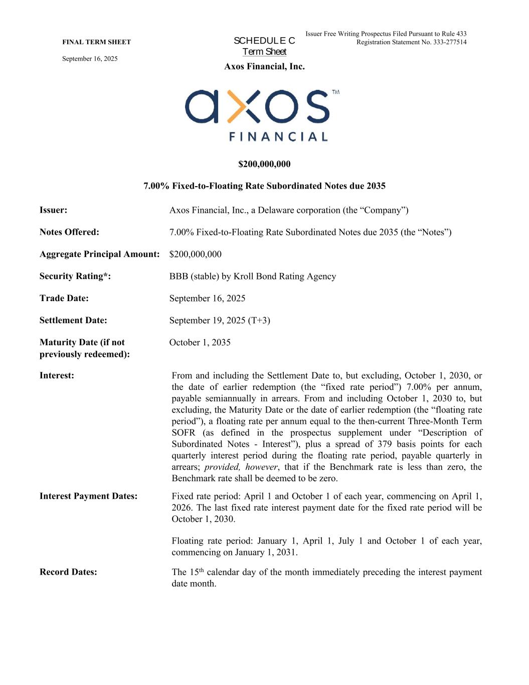 Axos Financial, Inc. $200,000,000 7.00% Fixed-to-Floating Rate Subordinated Notes due 2035 Issuer: Axos Financial, Inc., a Delaware corporation (the “Company”) Notes Offered: 7.00% Fixed-to-Floating Rate Subordinated Notes due 2035 (the “Notes”) Aggregate Principal Amount: $200,000,000 Security Rating*: BBB (stable) by Kroll Bond Rating Agency Trade Date: September 16, 2025 Settlement Date: September 19, 2025 (T+3) Maturity Date (if not previously redeemed): October 1, 2035 Interest: From and including the Settlement Date to, but excluding, October 1, 2030, or the date of earlier redemption (the “fixed rate period”) 7.00% per annum, payable semiannually in arrears. From and including October 1, 2030 to, but excluding, the Maturity Date or the date of earlier redemption (the “floating rate period”), a floating rate per annum equal to the then-current Three-Month Term SOFR (as defined in the prospectus supplement under “Description of Subordinated Notes - Interest”), plus a spread of 379 basis points for each quarterly interest period during the floating rate period, payable quarterly in arrears; provided, however, that if the Benchmark rate is less than zero, the Benchmark rate shall be deemed to be zero. Interest Payment Dates: Fixed rate period: April 1 and October 1 of each year, commencing on April 1, 2026. The last fixed rate interest payment date for the fixed rate period will be October 1, 2030. Floating rate period: January 1, April 1, July 1 and October 1 of each year, commencing on January 1, 2031. Record Dates: The 15th calendar day of the month immediately preceding the interest payment date month. Issuer Free Writing Prospectus Filed Pursuant to Rule 433 FINAL TERM SHEET Registration Statement No. 333-277514 September 16, 2025 SCHEDULE C Term Sheet