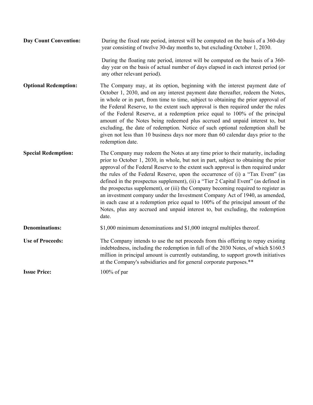 Day Count Convention: During the fixed rate period, interest will be computed on the basis of a 360-day year consisting of twelve 30-day months to, but excluding October 1, 2030. During the floating rate period, interest will be computed on the basis of a 360- day year on the basis of actual number of days elapsed in each interest period (or any other relevant period). Optional Redemption: The Company may, at its option, beginning with the interest payment date of October 1, 2030, and on any interest payment date thereafter, redeem the Notes, in whole or in part, from time to time, subject to obtaining the prior approval of the Federal Reserve, to the extent such approval is then required under the rules of the Federal Reserve, at a redemption price equal to 100% of the principal amount of the Notes being redeemed plus accrued and unpaid interest to, but excluding, the date of redemption. Notice of such optional redemption shall be given not less than 10 business days nor more than 60 calendar days prior to the redemption date. Special Redemption: The Company may redeem the Notes at any time prior to their maturity, including prior to October 1, 2030, in whole, but not in part, subject to obtaining the prior approval of the Federal Reserve to the extent such approval is then required under the rules of the Federal Reserve, upon the occurrence of (i) a “Tax Event” (as defined in the prospectus supplement), (ii) a “Tier 2 Capital Event” (as defined in the prospectus supplement), or (iii) the Company becoming required to register as an investment company under the Investment Company Act of 1940, as amended, in each case at a redemption price equal to 100% of the principal amount of the Notes, plus any accrued and unpaid interest to, but excluding, the redemption date. Denominations: $1,000 minimum denominations and $1,000 integral multiples thereof. Use of Proceeds: The Company intends to use the net proceeds from this offering to repay existing indebtedness, including the redemption in full of the 2030 Notes, of which $160.5 million in principal amount is currently outstanding, to support growth initiatives at the Company's subsidiaries and for general corporate purposes.** Issue Price: 100% of par