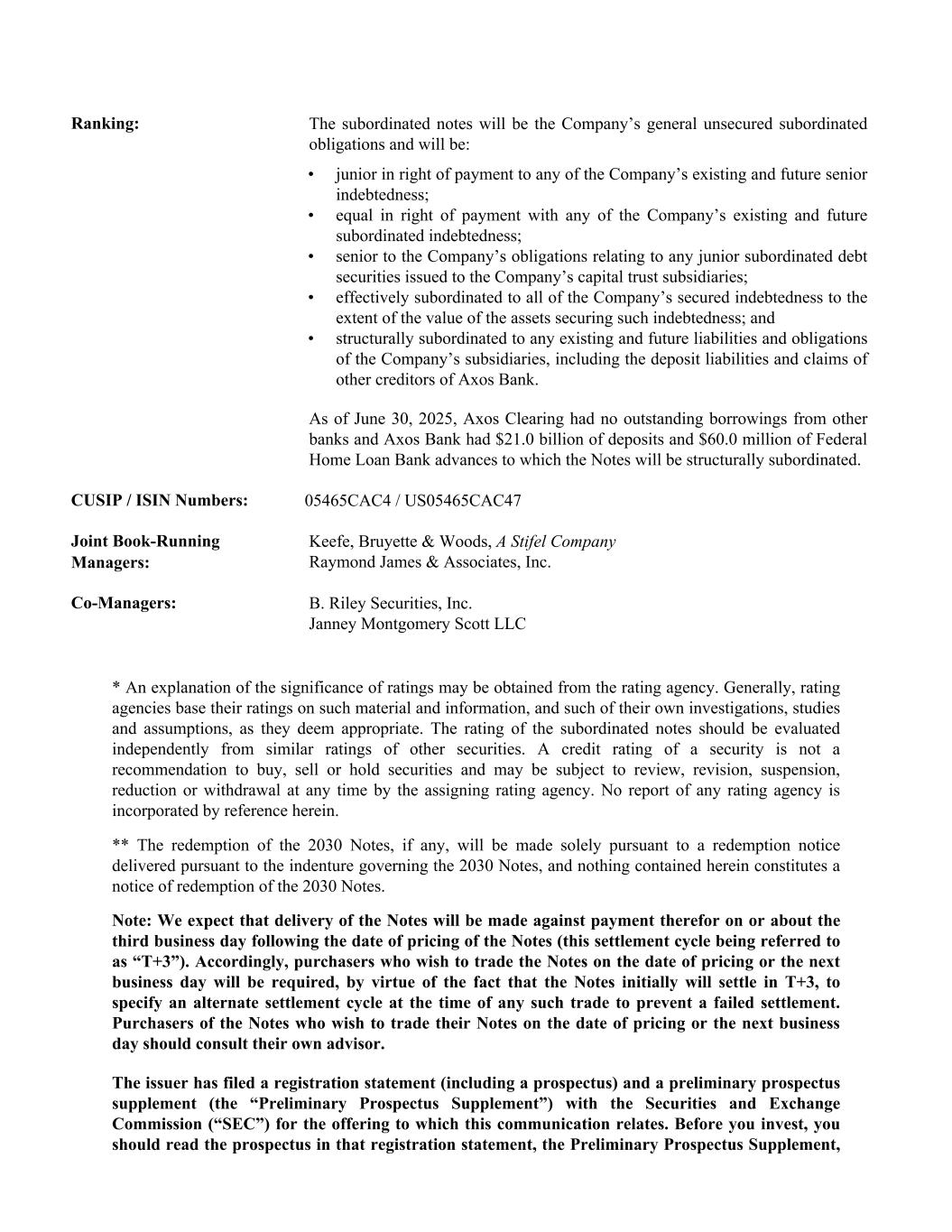 Ranking: The subordinated notes will be the Company’s general unsecured subordinated obligations and will be: • junior in right of payment to any of the Company’s existing and future senior indebtedness; • equal in right of payment with any of the Company’s existing and future subordinated indebtedness; • senior to the Company’s obligations relating to any junior subordinated debt securities issued to the Company’s capital trust subsidiaries; • effectively subordinated to all of the Company’s secured indebtedness to the extent of the value of the assets securing such indebtedness; and • structurally subordinated to any existing and future liabilities and obligations of the Company’s subsidiaries, including the deposit liabilities and claims of other creditors of Axos Bank. As of June 30, 2025, Axos Clearing had no outstanding borrowings from other banks and Axos Bank had $21.0 billion of deposits and $60.0 million of Federal Home Loan Bank advances to which the Notes will be structurally subordinated. CUSIP / ISIN Numbers: 05465CAC4 / US05465CAC47 Joint Book-Running Managers: Keefe, Bruyette & Woods, A Stifel Company Raymond James & Associates, Inc. Co-Managers: B. Riley Securities, Inc. Janney Montgomery Scott LLC * An explanation of the significance of ratings may be obtained from the rating agency. Generally, rating agencies base their ratings on such material and information, and such of their own investigations, studies and assumptions, as they deem appropriate. The rating of the subordinated notes should be evaluated independently from similar ratings of other securities. A credit rating of a security is not a recommendation to buy, sell or hold securities and may be subject to review, revision, suspension, reduction or withdrawal at any time by the assigning rating agency. No report of any rating agency is incorporated by reference herein. ** The redemption of the 2030 Notes, if any, will be made solely pursuant to a redemption notice delivered pursuant to the indenture governing the 2030 Notes, and nothing contained herein constitutes a notice of redemption of the 2030 Notes. Note: We expect that delivery of the Notes will be made against payment therefor on or about the third business day following the date of pricing of the Notes (this settlement cycle being referred to as “T+3”). Accordingly, purchasers who wish to trade the Notes on the date of pricing or the next business day will be required, by virtue of the fact that the Notes initially will settle in T+3, to specify an alternate settlement cycle at the time of any such trade to prevent a failed settlement. Purchasers of the Notes who wish to trade their Notes on the date of pricing or the next business day should consult their own advisor. The issuer has filed a registration statement (including a prospectus) and a preliminary prospectus supplement (the “Preliminary Prospectus Supplement”) with the Securities and Exchange Commission (“SEC”) for the offering to which this communication relates. Before you invest, you should read the prospectus in that registration statement, the Preliminary Prospectus Supplement,