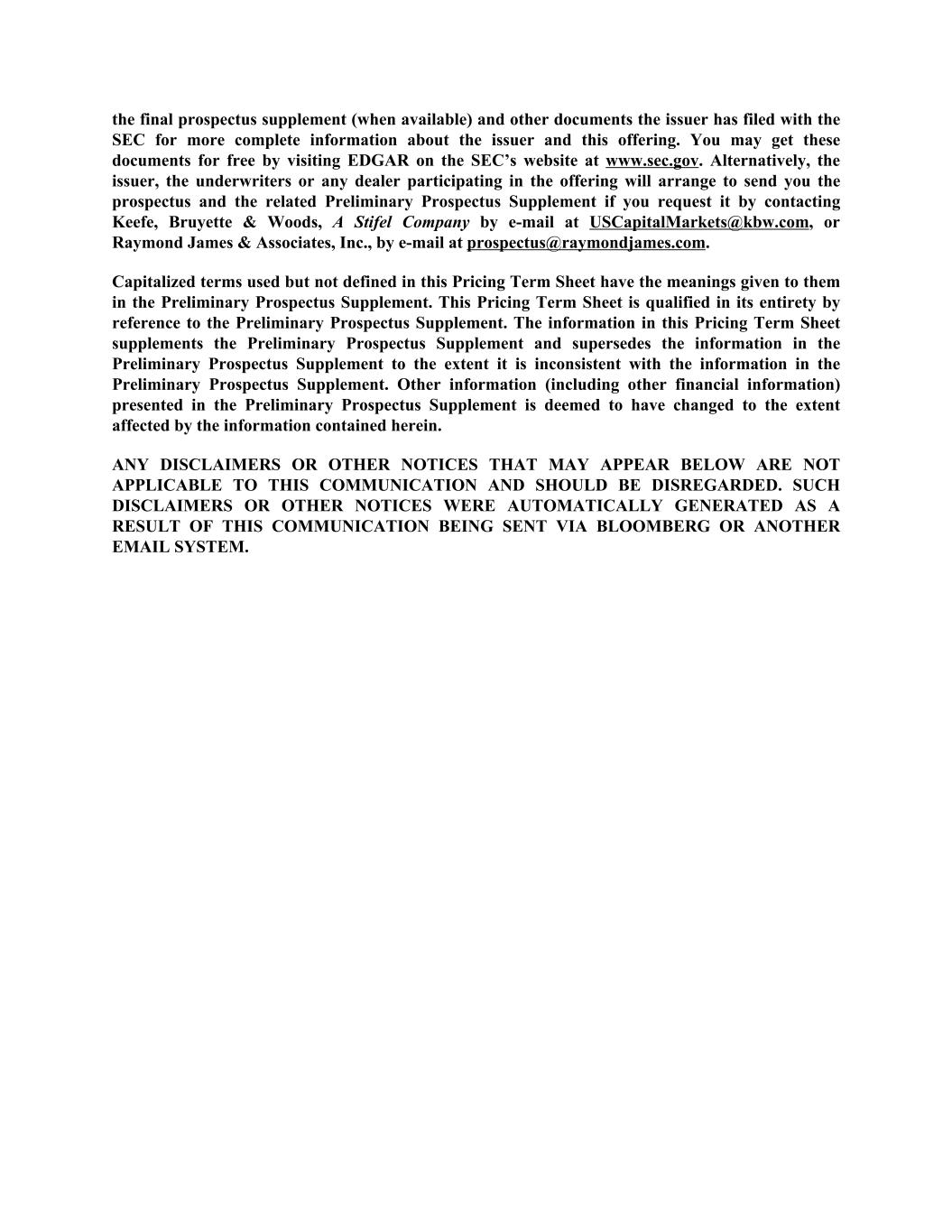 the final prospectus supplement (when available) and other documents the issuer has filed with the SEC for more complete information about the issuer and this offering. You may get these documents for free by visiting EDGAR on the SEC’s website at www.sec.gov. Alternatively, the issuer, the underwriters or any dealer participating in the offering will arrange to send you the prospectus and the related Preliminary Prospectus Supplement if you request it by contacting Keefe, Bruyette & Woods, A Stifel Company by e-mail at USCapitalMarkets@kbw.com, or Raymond James & Associates, Inc., by e-mail at prospectus@raymondjames.com. Capitalized terms used but not defined in this Pricing Term Sheet have the meanings given to them in the Preliminary Prospectus Supplement. This Pricing Term Sheet is qualified in its entirety by reference to the Preliminary Prospectus Supplement. The information in this Pricing Term Sheet supplements the Preliminary Prospectus Supplement and supersedes the information in the Preliminary Prospectus Supplement to the extent it is inconsistent with the information in the Preliminary Prospectus Supplement. Other information (including other financial information) presented in the Preliminary Prospectus Supplement is deemed to have changed to the extent affected by the information contained herein. ANY DISCLAIMERS OR OTHER NOTICES THAT MAY APPEAR BELOW ARE NOT APPLICABLE TO THIS COMMUNICATION AND SHOULD BE DISREGARDED. SUCH DISCLAIMERS OR OTHER NOTICES WERE AUTOMATICALLY GENERATED AS A RESULT OF THIS COMMUNICATION BEING SENT VIA BLOOMBERG OR ANOTHER EMAIL SYSTEM.
