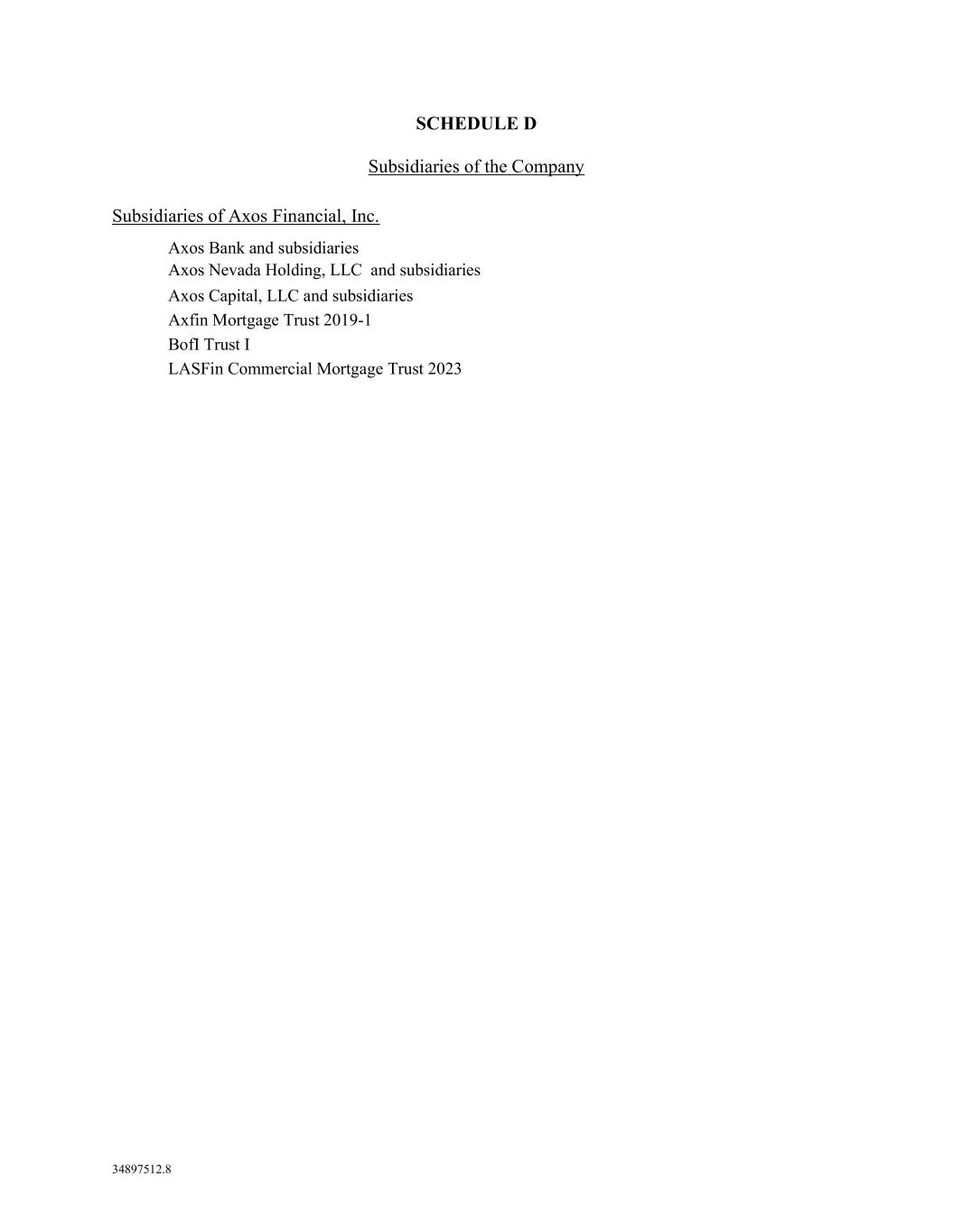 34897512.8 SCHEDULE D Subsidiaries of the Company Subsidiaries of Axos Financial, Inc. Axos Bank and subsidiaries Axos Nevada Holding, LLC and subsidiaries Axos Capital, LLC and subsidiaries Axfin Mortgage Trust 2019-1 BofI Trust I LASFin Commercial Mortgage Trust 2023