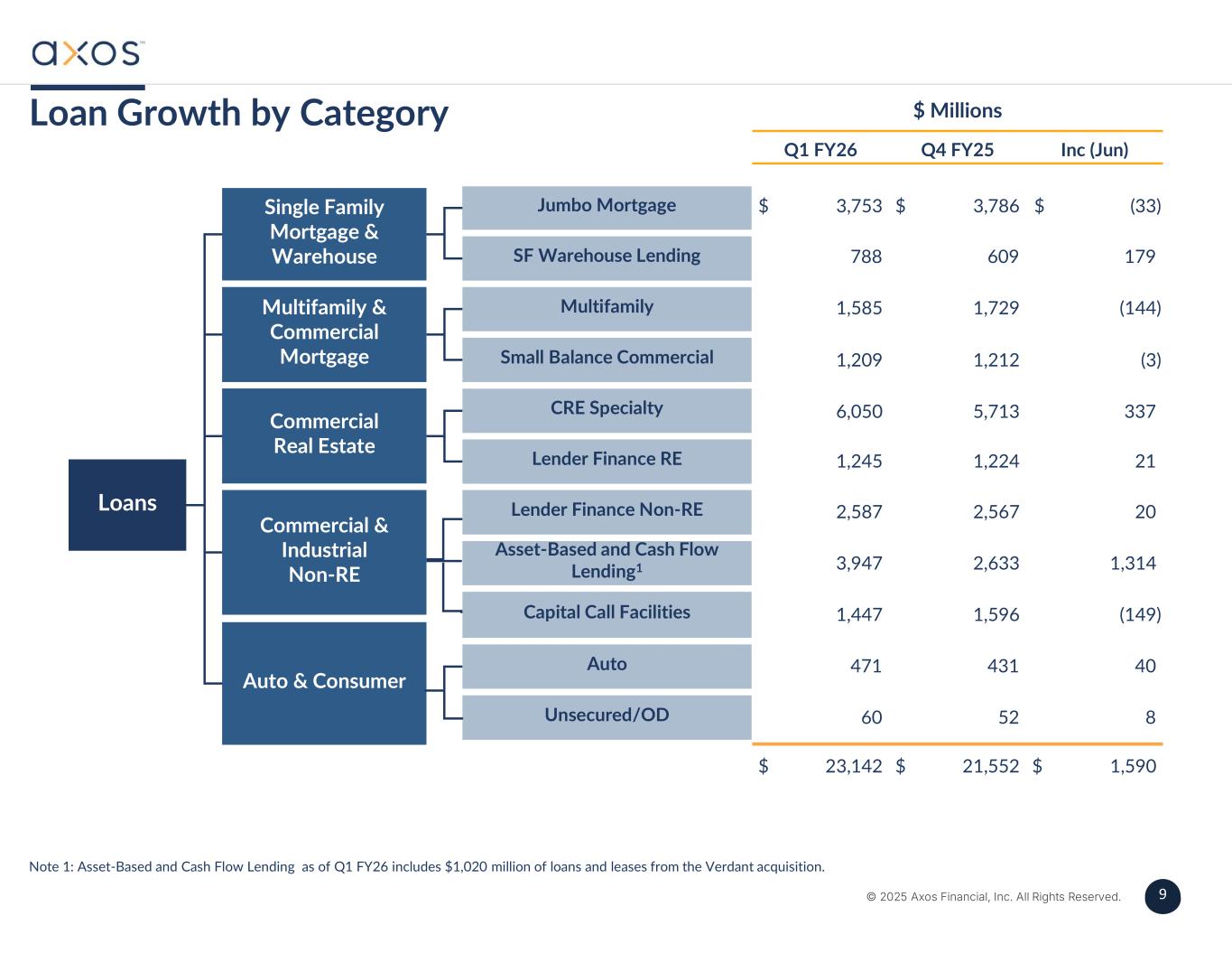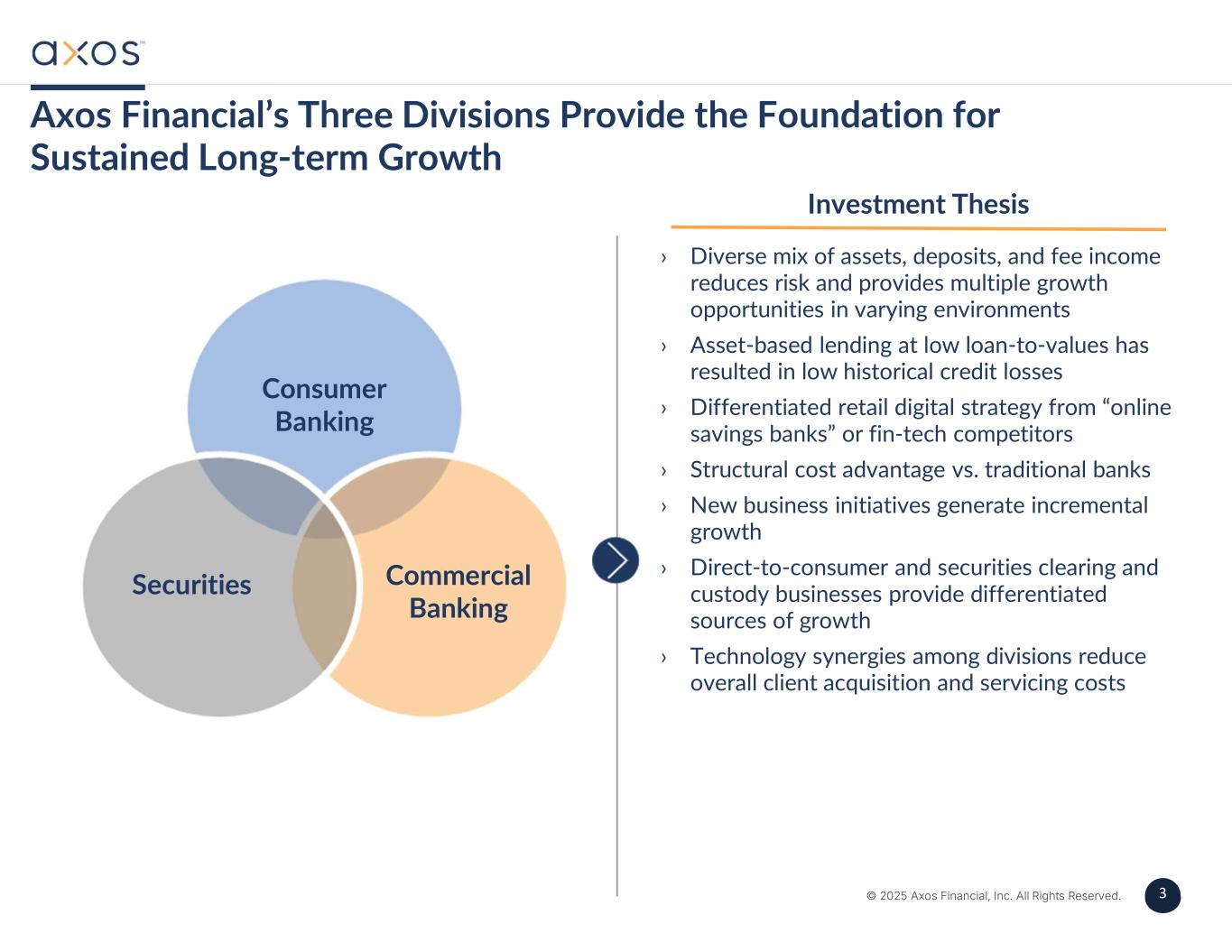 2 © 2025 Axos Financial, Inc. All Rights Reserved. 2 Safe Harbor This presentation contains forward-looking statements that involve risks and uncertainties, including without limitation statements relating to Axos Financial, Inc.’s (“Axos”) financial prospects and other projections of its performance and asset quality, Axos’ deposit balances and capital ratios, Axos’ ability to continue to grow profitably and increase its business, Axos’ ability to continue to diversify its lending and deposit franchises, the anticipated timing and financial performance of other offerings, initiatives, and acquisitions, expectations of the environment in which Axos operates and projections of future performance. These forward- looking statements are made on the basis of the views and assumptions of management regarding future events and performance as of the date of this presentation. Actual results and the timing of events could differ materially from those expressed or implied in such forward-looking statements as a result of risks and uncertainties, including without limitation Axos’ ability to successfully integrate acquisitions and realize the anticipated benefits of the transactions, changes in the interest rate environment, monetary policy, inflation, tariffs, government regulation, general economic conditions, changes in the competitive marketplace, conditions in the real estate markets in which we operate, risks associated with credit quality, our ability to attract and retain deposits and access other sources of liquidity, and the outcome and effects of litigation and other factors beyond our control. These and other risks and uncertainties detailed in Axos’ periodic reports filed with the Securities and Exchange Commission, including its Annual Report on Form 10-K for the fiscal year ended June 30, 2025, Form 10-Q for the quarter ended September 30, 2025 and its last earnings press release, could cause actual results to differ materially from those expressed or implied in any forward-looking statements. Readers are cautioned not to place undue reliance on these forward-looking statements, which speak only as of the date of this press release. Axos undertakes no obligation to publicly update or revise any forward-looking statements, whether as a result of new information, future events or otherwise. All written and oral forward-looking statements made in connection with this presentation, which are attributable to us or persons acting on Axos’ behalf are expressly qualified in their entirety by the foregoing information.