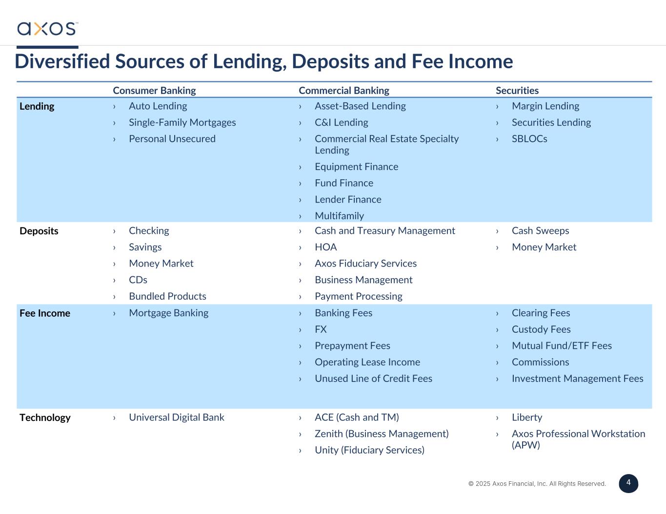 3 © 2025 Axos Financial, Inc. All Rights Reserved. 3 › Diverse mix of assets, deposits, and fee income reduces risk and provides multiple growth opportunities in varying environments › Asset-based lending at low loan-to-values has resulted in low historical credit losses › Differentiated retail digital strategy from “online savings banks” or fin-tech competitors › Structural cost advantage vs. traditional banks › New business initiatives generate incremental growth › Direct-to-consumer and securities clearing and custody businesses provide differentiated sources of growth › Technology synergies among divisions reduce overall client acquisition and servicing costs Investment Thesis Axos Financial’s Three Divisions Provide the Foundation for Sustained Long-term Growth Consumer Banking Commercial Banking Securities