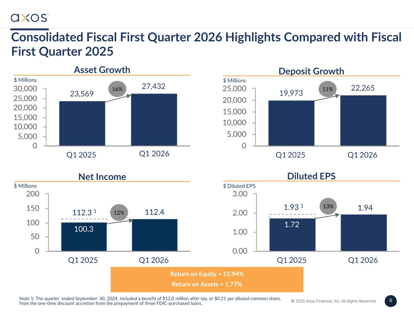 5 © 2025 Axos Financial, Inc. All Rights Reserved. 5 PercentilePeer Group1Axos Bank 91%0.73%1.69%ROAA 92%6.71%16.13%Return on Equity 31%2.45%2.09%NIE/Avg Assets 96%2.85%4.71%Net Interest Income 6%71.76%43.34%Efficiency Ratio Source: Uniform Bank Performance Report (UBPR) as of September 30, 2025; data retrieved November 3, 2025. Note 1: Peer group is all savings banks with assets greater than $1 billion for quarter ended September 30, 2025. Axos is a Top Performer Versus Bank Peer Group The 92% on ROE means that the Bank outperformed 92% of all banks. The 6% efficiency ratio ranking means that only 6% of banks have lower expenses in comparison to their revenues.