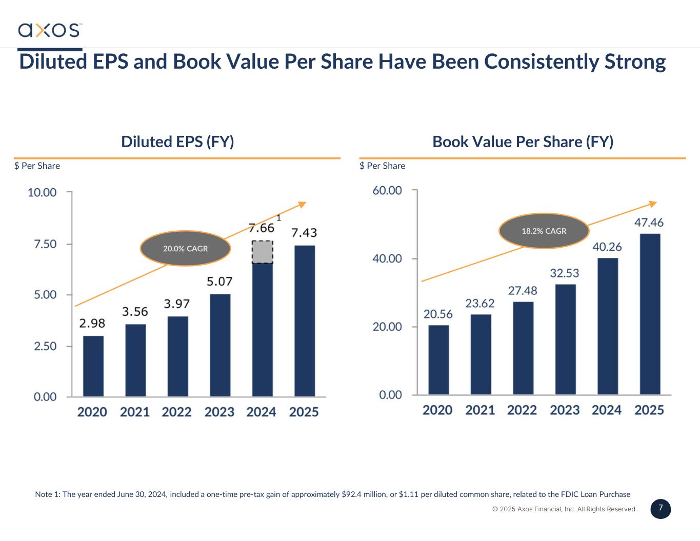 6 © 2025 Axos Financial, Inc. All Rights Reserved. 6 Return on Equity = 15.94% Return on Assets = 1.77% Consolidated Fiscal First Quarter 2026 Highlights Compared with Fiscal First Quarter 2025 16% 11% 12% 13% Asset Growth Deposit Growth Net Income Diluted EPS $ Millions $ Millions $ Millions $ Diluted EPS Q1 2026 112.4 1.94 Note 1: The quarter ended September 30, 2024, included a benefit of $12.0 million after tax, or $0.21 per diluted common share, from the one-time discount accretion from the prepayment of three FDIC-purchased loans. 112.3 1 1.93 1 100.3 1.72