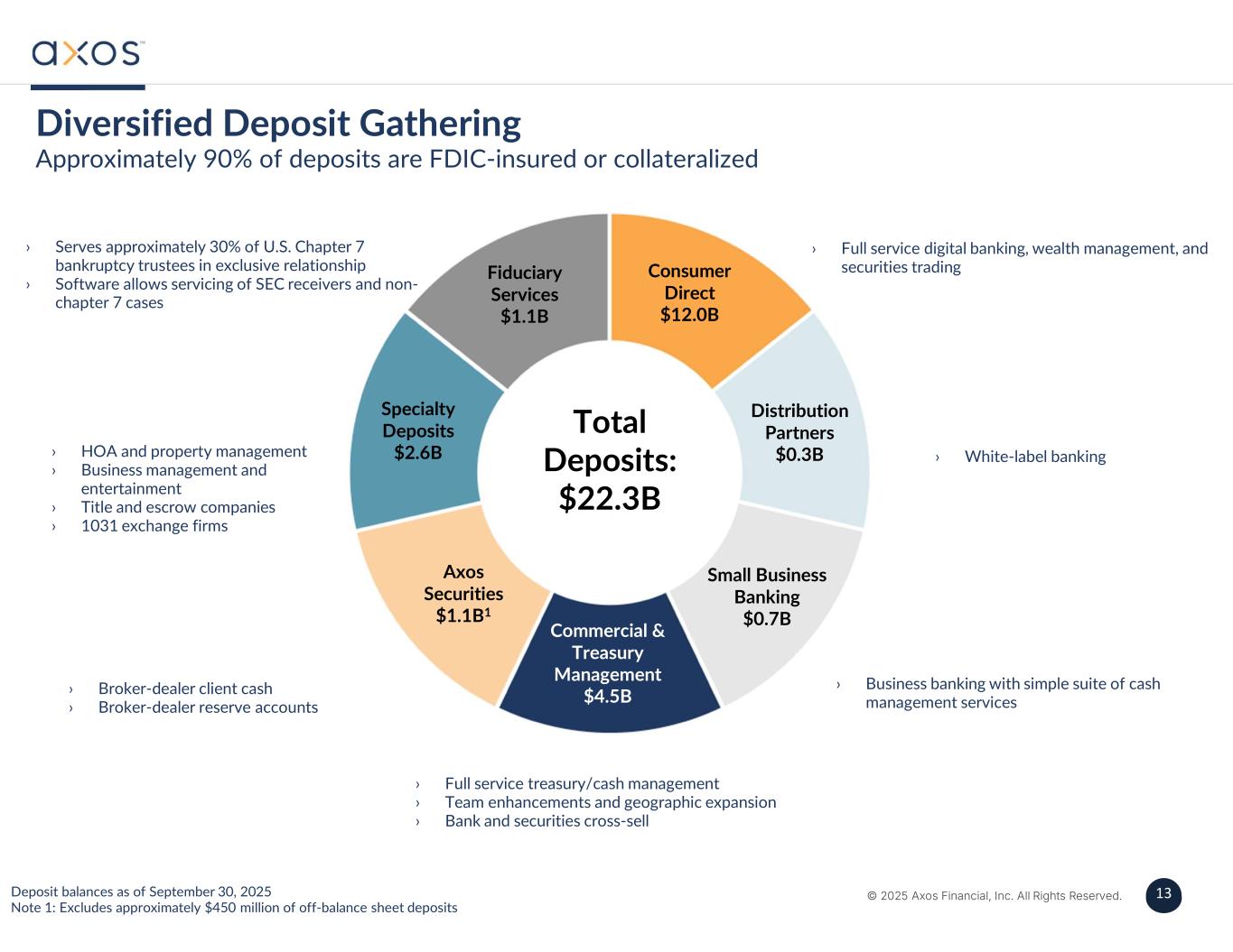 12 © 2025 Axos Financial, Inc. All Rights Reserved. 12 Commercial Real Estate Specialty1 Detail as of September 30, 2025 60% of total Commercial Real Estate Specialty balance at September 30, 2025 is indirect note structures where Axos has first payment priority; these loans carry a weighted-average LTV of 43%. Below is a breakdown of the stage of the properties underlying the CRES loans: Note 1: Includes Commercial Real Estate Specialty loan portfolio only Weighted Avg. LTVBalance (mm)Loan Type 47 %$ 2,837Construction 472,107Bridge 57950Stabilized 42156Pre-development 48 %$ 6,050Total