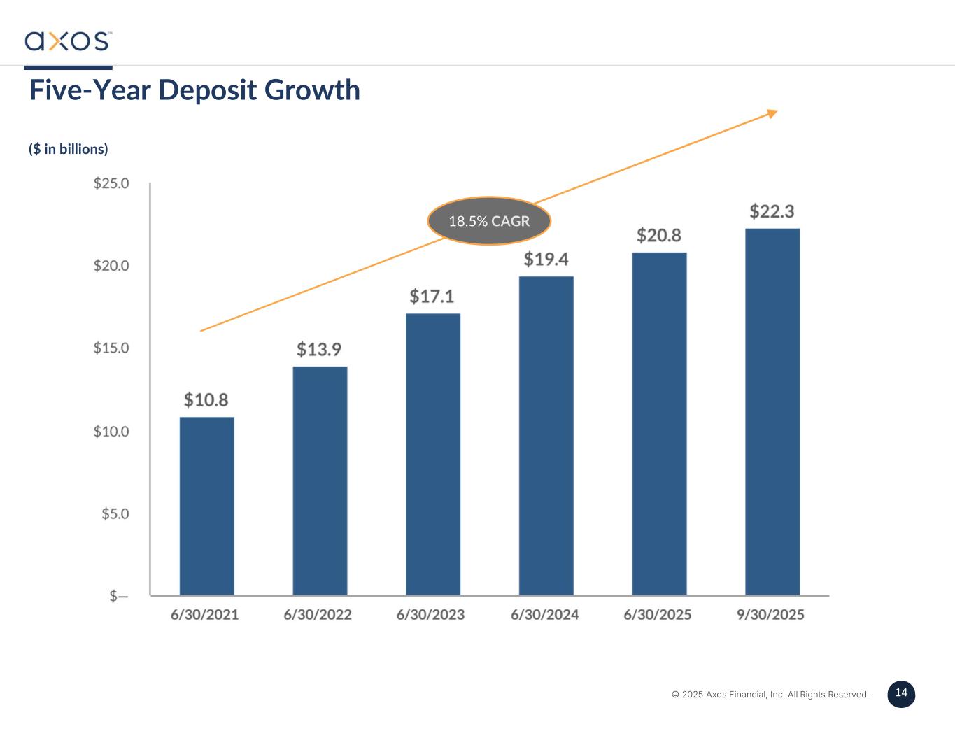 14 © 2025 Axos Financial, Inc. All Rights Reserved. 14 Five-Year Deposit Growth ($ in billions) 18.5% CAGR