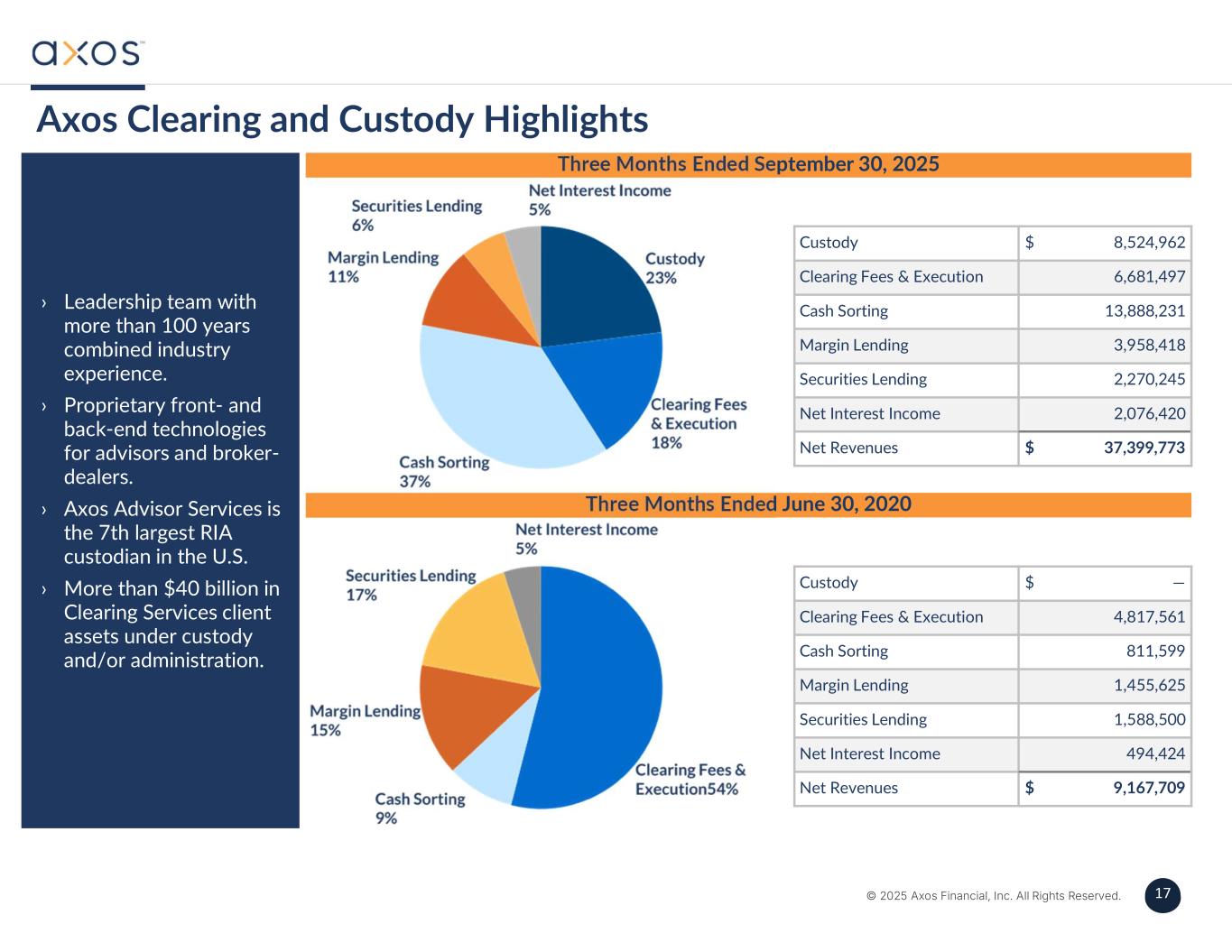 16 © 2025 Axos Financial, Inc. All Rights Reserved. 16 Non-Interest Income Growth and Diversification Year Ended June 30, 2020 Three Months Ended September 30, 2025 Total Non-Interest Income = $103.0 million Total Non-Interest Income = $129.4 million1 Note 1: Represents annualized quarterly September 30, 2025 data ($ in millions) ($ in millions)