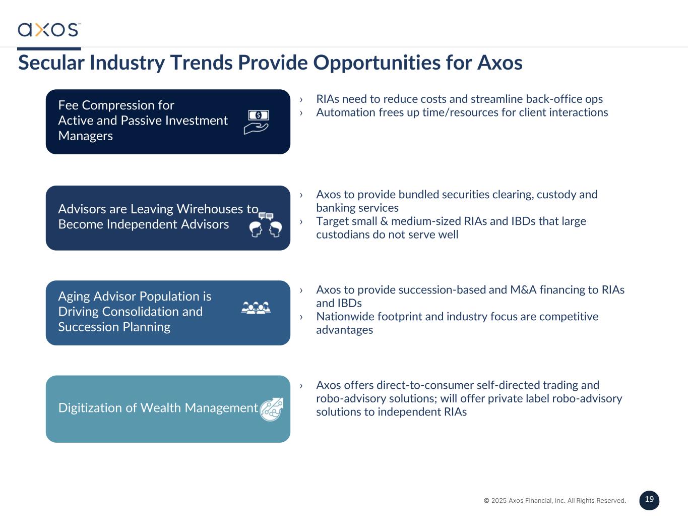 18 © 2025 Axos Financial, Inc. All Rights Reserved. 18 Axos Advisor Services (AAS) At A Glance Liberty Provides a Comprehensive Turnkey Platform Automatic Reconciliation Serving 211 RIAs1 ($1M+ AUC) ~$33B Assets Under Custody Small RIAs 2% of Total AUC Advisors with <$25M in AUC Traditional RIAs 44% of Total AUC Gathers and manages assets, works directly with investor TAMPs 54% of Total AUC Turnkey Asset Management Platform, relies on Reps to gather assets and maintain relationship with investor Data as of September 30, 2025 Note 1: 257 total advisors on Liberty platform; advisors with <$1M AUC comprise <$12M in total assets; there are 9 non-AAS RIAs not on Liberty at Axos Clearing