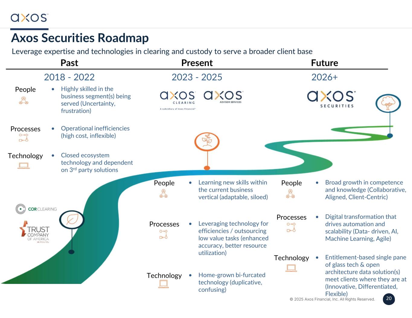 19 © 2025 Axos Financial, Inc. All Rights Reserved. 19 Secular Industry Trends Provide Opportunities for Axos › RIAs need to reduce costs and streamline back-office ops › Automation frees up time/resources for client interactions › Axos to provide bundled securities clearing, custody and banking services › Target small & medium-sized RIAs and IBDs that large custodians do not serve well › Axos to provide succession-based and M&A financing to RIAs and IBDs › Nationwide footprint and industry focus are competitive advantages › Axos offers direct-to-consumer self-directed trading and robo-advisory solutions; will offer private label robo-advisory solutions to independent RIAs Fee Compression for Active and Passive Investment Managers Digitization of Wealth Management Aging Advisor Population is Driving Consolidation and Succession Planning Advisors are Leaving Wirehouses to Become Independent Advisors