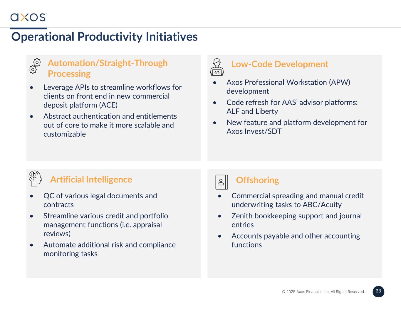 23 © 2025 Axos Financial, Inc. All Rights Reserved. 23 Automation/Straight-Through Processing Low-Code Development Artificial Intelligence Offshoring • Axos Professional Workstation (APW) development • Code refresh for AAS’ advisor platforms: ALF and Liberty • New feature and platform development for Axos Invest/SDT • QC of various legal documents and contracts • Streamline various credit and portfolio management functions (i.e. appraisal reviews) • Automate additional risk and compliance monitoring tasks • Commercial spreading and manual credit underwriting tasks to ABC/Acuity • Zenith bookkeeping support and journal entries • Accounts payable and other accounting functions • Leverage APIs to streamline workflows for clients on front end in new commercial deposit platform (ACE) • Abstract authentication and entitlements out of core to make it more scalable and customizable Operational Productivity Initiatives