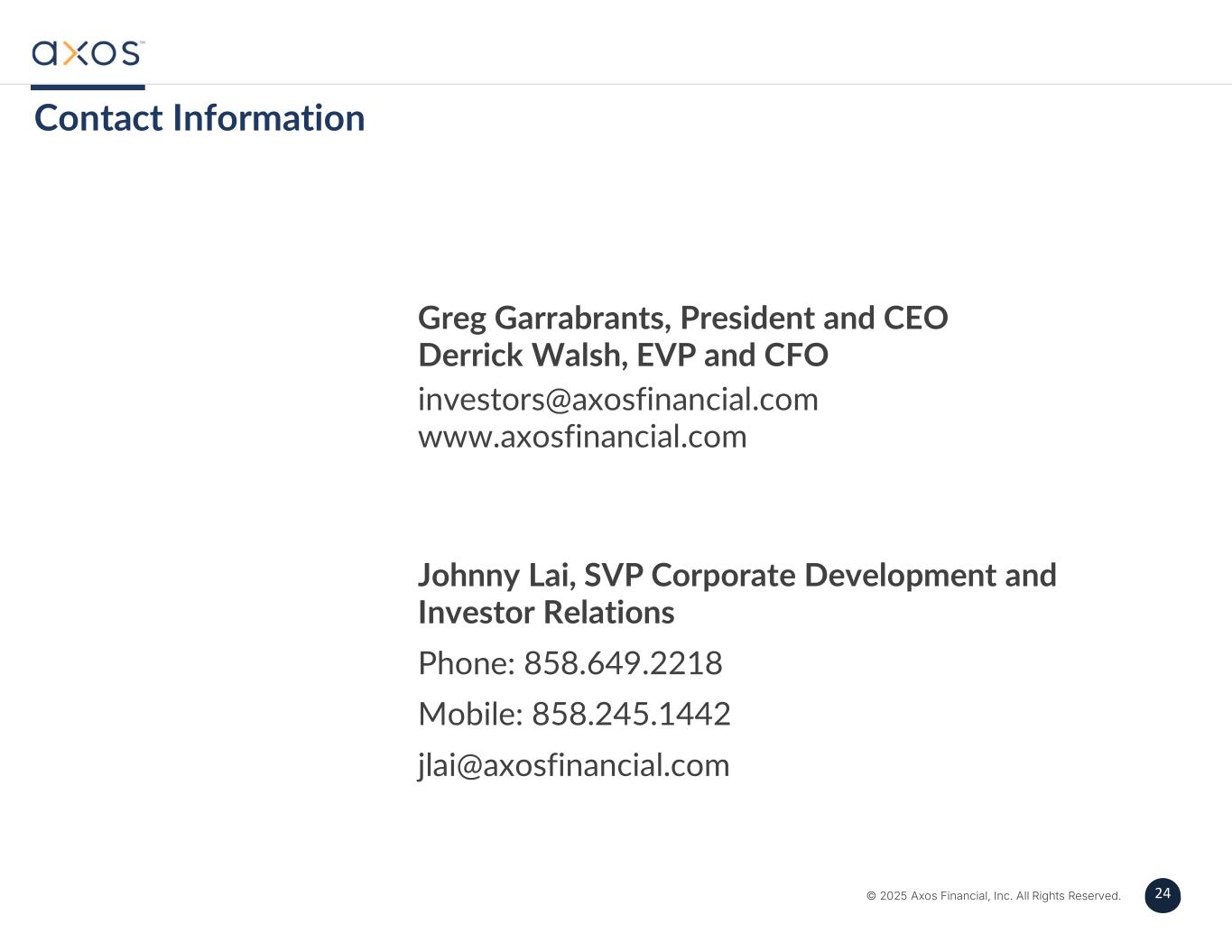 24 © 2025 Axos Financial, Inc. All Rights Reserved. 24 Greg Garrabrants, President and CEO Derrick Walsh, EVP and CFO investors@axosfinancial.com www.axosfinancial.com Johnny Lai, SVP Corporate Development and Investor Relations Phone: 858.649.2218 Mobile: 858.245.1442 jlai@axosfinancial.com Contact Information