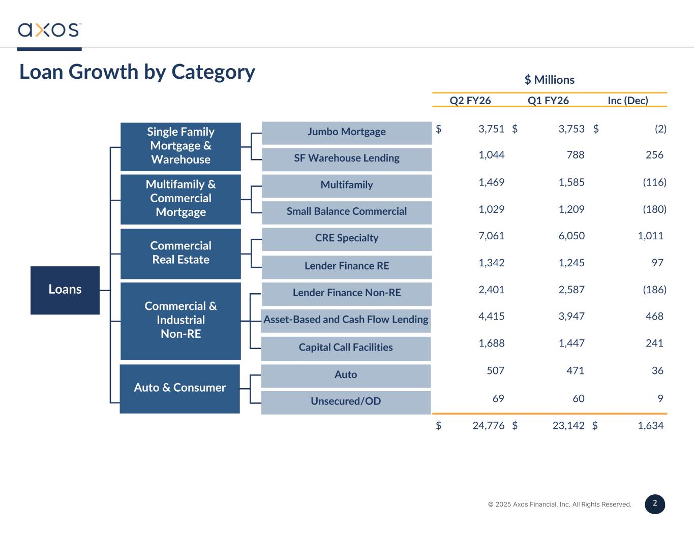 2 © 2025 Axos Financial, Inc. All Rights Reserved. 2 Loan Growth by Category $ Millions SF Warehouse Lending Multifamily Small Balance Commercial Jumbo Mortgage Asset-Based and Cash Flow Lending Lender Finance Non-RE Capital Call Facilities Auto Unsecured/OD Single Family Mortgage & Warehouse Multifamily & Commercial Mortgage Commercial Real Estate Commercial & Industrial Non-RE Loans Inc (Dec)Q1 FY26Q2 FY26 $ (2)$ 3,753$ 3,751 2567881,044 (116)1,5851,469 (180)1,2091,029 1,0116,0507,061 971,2451,342 (186)2,5872,401 4683,9474,415 2411,4471,688 36471507 96069 $ 1,634$ 23,142$ 24,776 Lender Finance RE CRE Specialty Auto & Consumer