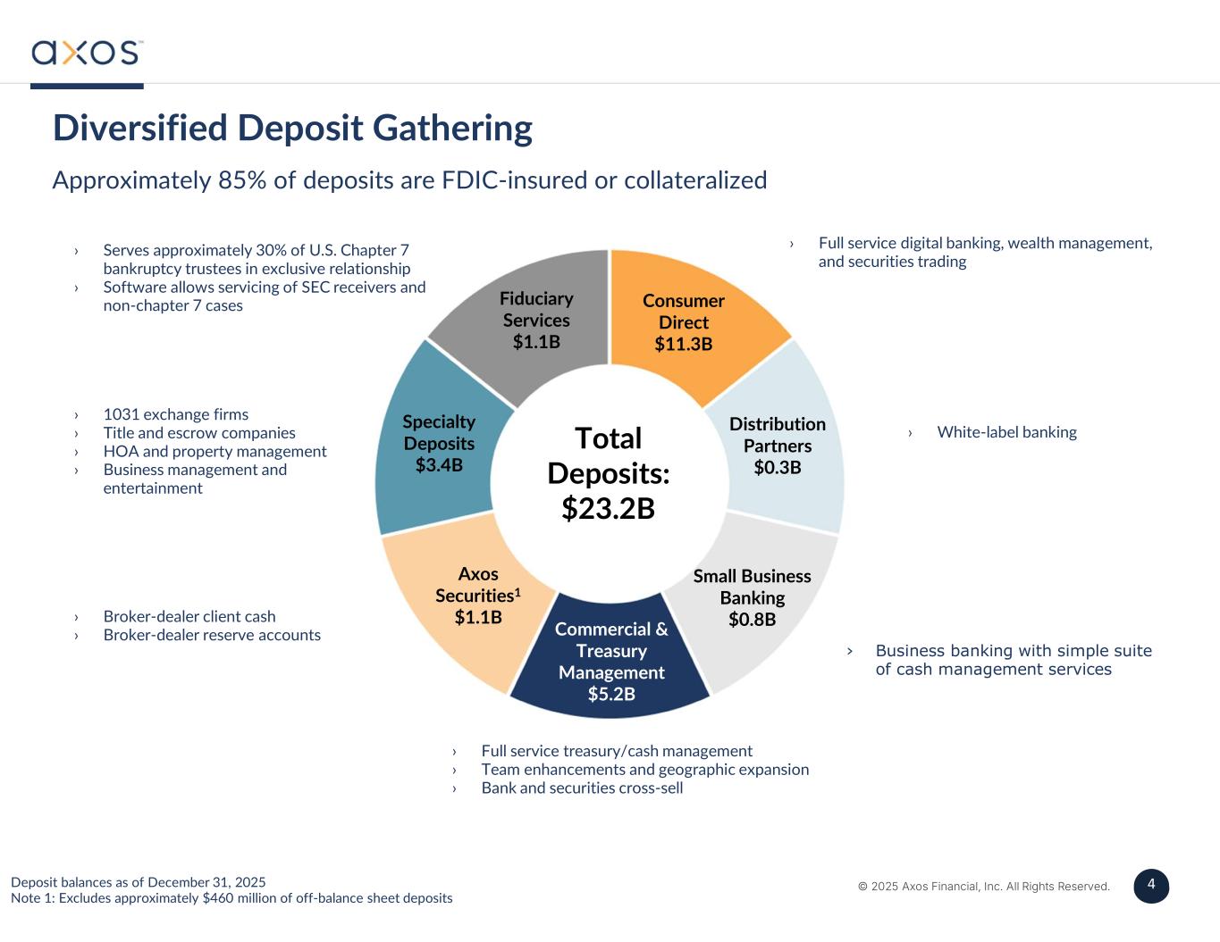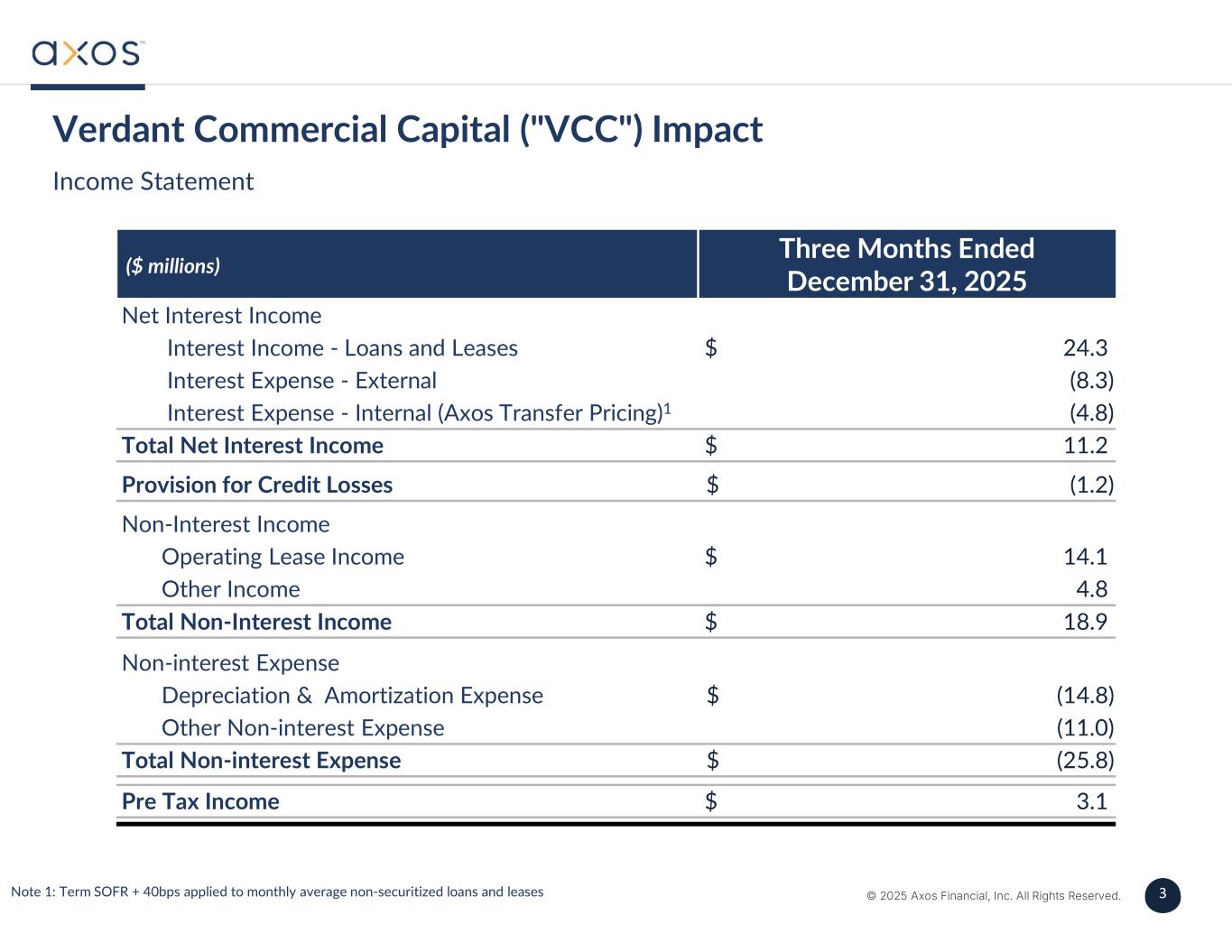 3 © 2025 Axos Financial, Inc. All Rights Reserved. 3 Three Months Ended December 31, 2025 ($ millions) Net Interest Income $ 24.3Interest Income - Loans and Leases (8.3)Interest Expense - External (4.8)Interest Expense - Internal (Axos Transfer Pricing)1 $ 11.2Total Net Interest Income $ (1.2)Provision for Credit Losses Non-Interest Income $ 14.1Operating Lease Income 4.8Other Income $ 18.9Total Non-Interest Income Non-interest Expense $ (14.8)Depreciation & Amortization Expense (11.0)Other Non-interest Expense $ (25.8)Total Non-interest Expense $ 3.1Pre Tax Income Income Statement Verdant Commercial Capital ("VCC") Impact Note 1: Term SOFR + 40bps applied to monthly average non-securitized loans and leases