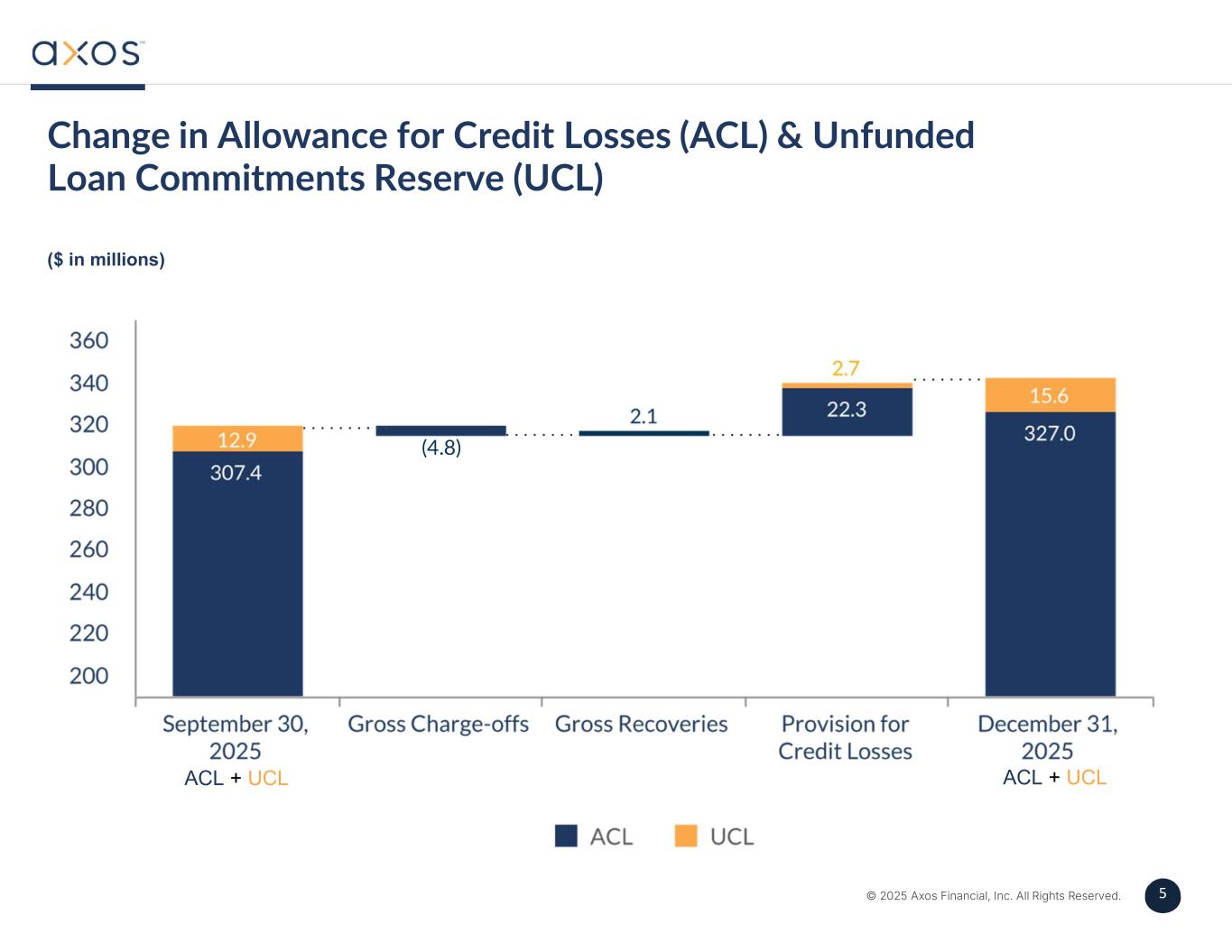 4 © 2025 Axos Financial, Inc. All Rights Reserved. 4 Diversified Deposit Gathering Deposit balances as of December 31, 2025 Note 1: Excludes approximately $460 million of off-balance sheet deposits › Serves approximately 30% of U.S. Chapter 7 bankruptcy trustees in exclusive relationship › Software allows servicing of SEC receivers and non-chapter 7 cases › Full service digital banking, wealth management, and securities trading › White-label banking › Business banking with simple suite of cash management services › 1031 exchange firms › Title and escrow companies › HOA and property management › Business management and entertainment › Broker-dealer client cash › Broker-dealer reserve accounts › Full service treasury/cash management › Team enhancements and geographic expansion › Bank and securities cross-sell Fiduciary Services $1.1B Consumer Direct $11.3B Specialty Deposits $3.4B Distribution Partners $0.3B Axos Securities1 $1.1B Small Business Banking $0.8BCommercial & Treasury Management $5.2B Approximately 85% of deposits are FDIC-insured or collateralized Total Deposits: $23.2B