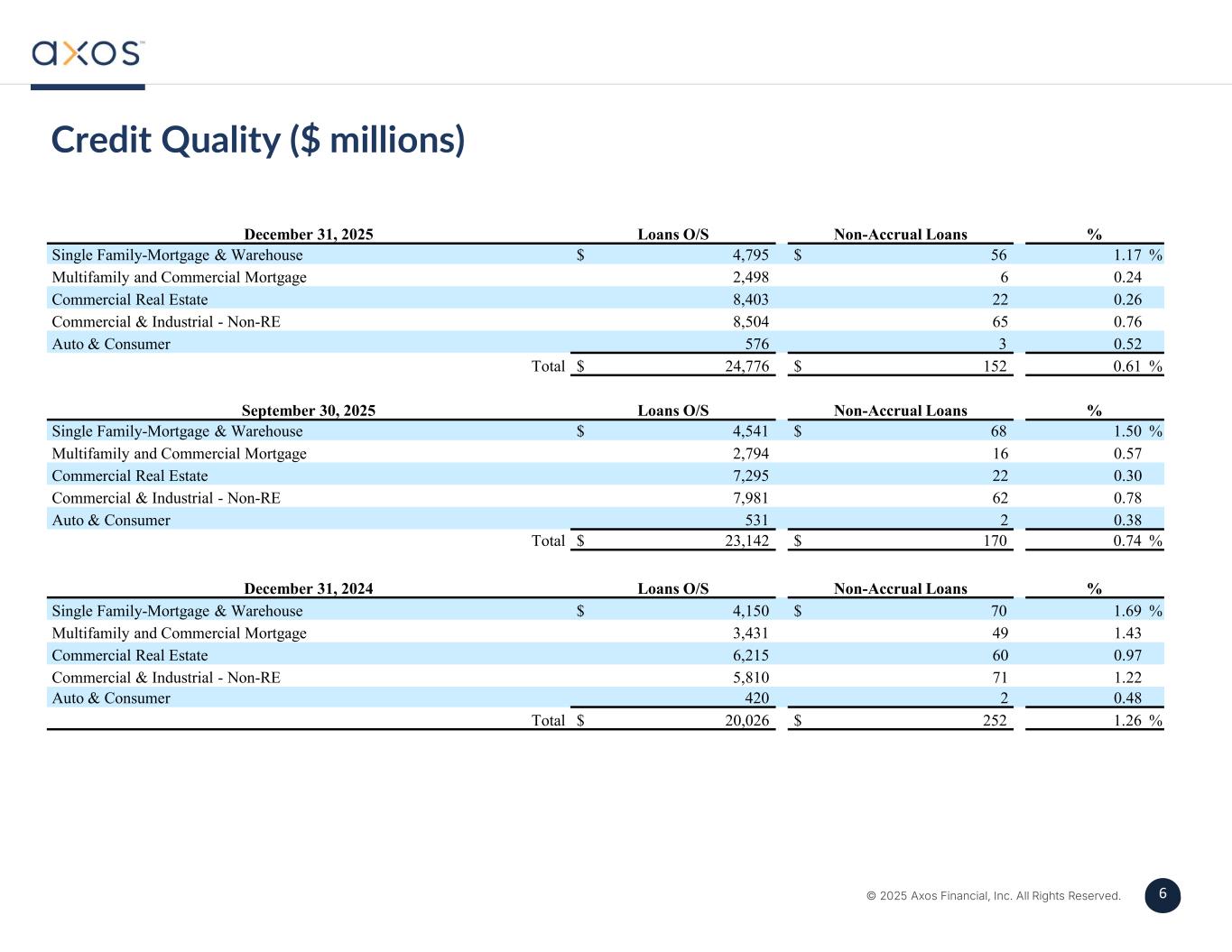 5 © 2025 Axos Financial, Inc. All Rights Reserved. 5 Change in Allowance for Credit Losses (ACL) & Unfunded Loan Commitments Reserve (UCL) ($ in millions) ACL + UCL ACL + UCL (4.8)