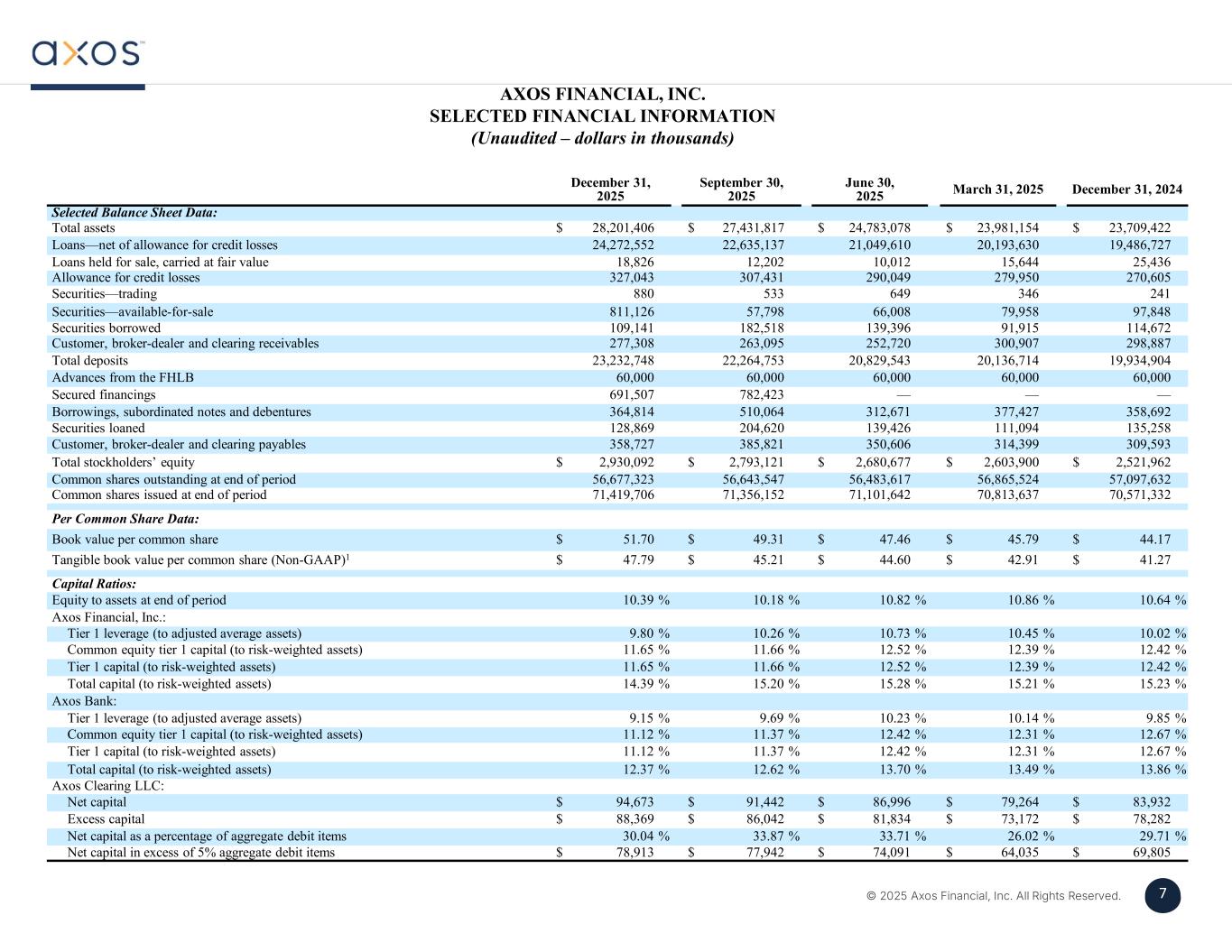 6 © 2025 Axos Financial, Inc. All Rights Reserved. 6 Credit Quality ($ millions) %Non-Accrual LoansLoans O/SDecember 31, 2025 1.17 %$ 56$ 4,795Single Family-Mortgage & Warehouse 0.2462,498Multifamily and Commercial Mortgage 0.26228,403Commercial Real Estate 0.76658,504Commercial & Industrial - Non-RE 0.523576Auto & Consumer 0.61 %$ 152$ 24,776Total %Non-Accrual LoansLoans O/SSeptember 30, 2025 1.50 %$ 68$ 4,541Single Family-Mortgage & Warehouse 0.57162,794Multifamily and Commercial Mortgage 0.30227,295Commercial Real Estate 0.78627,981Commercial & Industrial - Non-RE 0.382531Auto & Consumer 0.74 %$ 170$ 23,142Total %Non-Accrual LoansLoans O/SDecember 31, 2024 1.69 %$ 70$ 4,150Single Family-Mortgage & Warehouse 1.43493,431Multifamily and Commercial Mortgage 0.97606,215Commercial Real Estate 1.22715,810Commercial & Industrial - Non-RE 0.482420Auto & Consumer 1.26 %$ 252$ 20,026Total