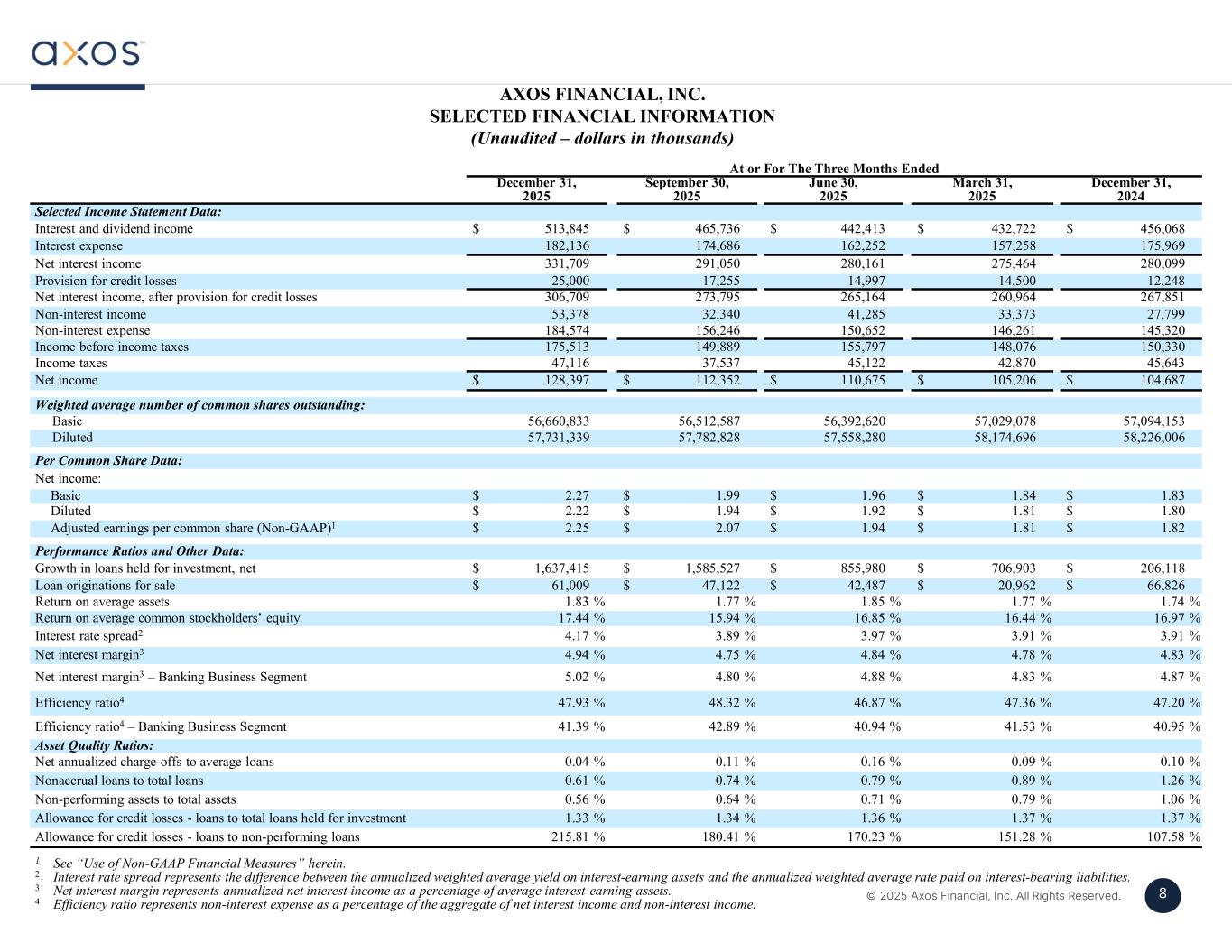 7 © 2025 Axos Financial, Inc. All Rights Reserved. 7 December 31, 2024March 31, 2025June 30, 2025 September 30, 2025 December 31, 2025 Selected Balance Sheet Data: $ 23,709,422$ 23,981,154$ 24,783,078$ 27,431,817$ 28,201,406Total assets 19,486,72720,193,63021,049,61022,635,13724,272,552Loans—net of allowance for credit losses 25,43615,64410,01212,20218,826Loans held for sale, carried at fair value 270,605279,950290,049307,431327,043Allowance for credit losses 241346649533880Securities—trading 97,84879,95866,00857,798811,126Securities—available-for-sale 114,67291,915139,396182,518109,141Securities borrowed 298,887300,907252,720263,095277,308Customer, broker-dealer and clearing receivables 19,934,90420,136,71420,829,54322,264,75323,232,748Total deposits 60,00060,00060,00060,00060,000Advances from the FHLB ———782,423691,507Secured financings 358,692377,427312,671510,064364,814Borrowings, subordinated notes and debentures 135,258111,094139,426204,620128,869Securities loaned 309,593314,399350,606385,821358,727Customer, broker-dealer and clearing payables $ 2,521,962$ 2,603,900$ 2,680,677$ 2,793,121$ 2,930,092Total stockholders’ equity 57,097,63256,865,52456,483,61756,643,54756,677,323Common shares outstanding at end of period 70,571,33270,813,63771,101,64271,356,15271,419,706Common shares issued at end of period Per Common Share Data: $ 44.17$ 45.79$ 47.46$ 49.31$ 51.70Book value per common share $ 41.27$ 42.91$ 44.60$ 45.21$ 47.79Tangible book value per common share (Non-GAAP)1 Capital Ratios: 10.64 %10.86 %10.82 %10.18 %10.39 %Equity to assets at end of period Axos Financial, Inc.: 10.02 %10.45 %10.73 %10.26 %9.80 %Tier 1 leverage (to adjusted average assets) 12.42 %12.39 %12.52 %11.66 %11.65 %Common equity tier 1 capital (to risk-weighted assets) 12.42 %12.39 %12.52 %11.66 %11.65 %Tier 1 capital (to risk-weighted assets) 15.23 %15.21 %15.28 %15.20 %14.39 %Total capital (to risk-weighted assets) Axos Bank: 9.85 %10.14 %10.23 %9.69 %9.15 %Tier 1 leverage (to adjusted average assets) 12.67 %12.31 %12.42 %11.37 %11.12 %Common equity tier 1 capital (to risk-weighted assets) 12.67 %12.31 %12.42 %11.37 %11.12 %Tier 1 capital (to risk-weighted assets) 13.86 %13.49 %13.70 %12.62 %12.37 %Total capital (to risk-weighted assets) Axos Clearing LLC: $ 83,932$ 79,264$ 86,996$ 91,442$ 94,673Net capital $ 78,282$ 73,172$ 81,834$ 86,042$ 88,369Excess capital 29.71 %26.02 %33.71 %33.87 %30.04 %Net capital as a percentage of aggregate debit items $ 69,805$ 64,035$ 74,091$ 77,942$ 78,913Net capital in excess of 5% aggregate debit items AXOS FINANCIAL, INC. SELECTED FINANCIAL INFORMATION (Unaudited – dollars in thousands)