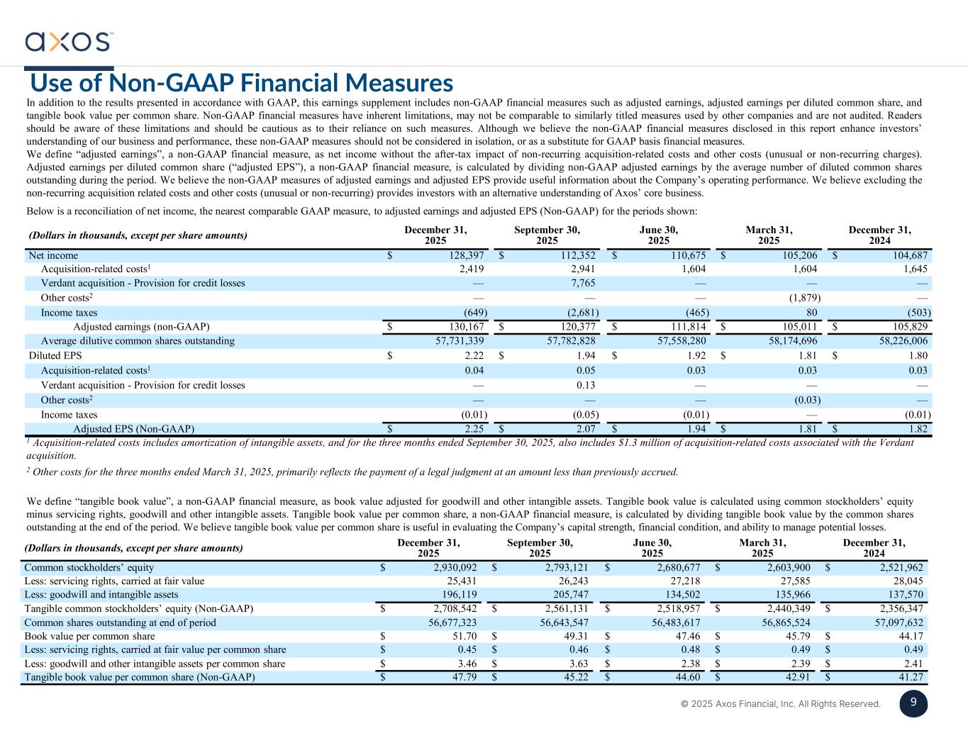 8 © 2025 Axos Financial, Inc. All Rights Reserved. 8 At or For The Three Months Ended December 31, 2024 March 31, 2025 June 30, 2025 September 30, 2025 December 31, 2025 Selected Income Statement Data: $ 456,068$ 432,722$ 442,413$ 465,736$ 513,845Interest and dividend income 175,969157,258162,252174,686182,136Interest expense 280,099275,464280,161291,050331,709Net interest income 12,24814,50014,99717,25525,000Provision for credit losses 267,851260,964265,164273,795306,709Net interest income, after provision for credit losses 27,79933,37341,28532,34053,378Non-interest income 145,320146,261150,652156,246184,574Non-interest expense 150,330148,076155,797149,889175,513Income before income taxes 45,64342,87045,12237,53747,116Income taxes $ 104,687$ 105,206$ 110,675$ 112,352$ 128,397Net income Weighted average number of common shares outstanding: 57,094,15357,029,07856,392,62056,512,58756,660,833Basic 58,226,00658,174,69657,558,28057,782,82857,731,339Diluted Per Common Share Data: Net income: $ 1.83$ 1.84$ 1.96$ 1.99$ 2.27Basic $ 1.80$ 1.81$ 1.92$ 1.94$ 2.22Diluted $ 1.82$ 1.81$ 1.94$ 2.07$ 2.25Adjusted earnings per common share (Non-GAAP)1 Performance Ratios and Other Data: $ 206,118$ 706,903$ 855,980$ 1,585,527$ 1,637,415Growth in loans held for investment, net $ 66,826$ 20,962$ 42,487$ 47,122$ 61,009Loan originations for sale 1.74 %1.77 %1.85 %1.77 %1.83 %Return on average assets 16.97 %16.44 %16.85 %15.94 %17.44 %Return on average common stockholders’ equity 3.91 %3.91 %3.97 %3.89 %4.17 %Interest rate spread2 4.83 %4.78 %4.84 %4.75 %4.94 %Net interest margin3 4.87 %4.83 %4.88 %4.80 %5.02 %Net interest margin3 – Banking Business Segment 47.20 %47.36 %46.87 %48.32 %47.93 %Efficiency ratio4 40.95 %41.53 %40.94 %42.89 %41.39 %Efficiency ratio4 – Banking Business Segment Asset Quality Ratios: 0.10 %0.09 %0.16 %0.11 %0.04 %Net annualized charge-offs to average loans 1.26 %0.89 %0.79 %0.74 %0.61 %Nonaccrual loans to total loans 1.06 %0.79 %0.71 %0.64 %0.56 %Non-performing assets to total assets 1.37 %1.37 %1.36 %1.34 %1.33 %Allowance for credit losses - loans to total loans held for investment 107.58 %151.28 %170.23 %180.41 %215.81 %Allowance for credit losses - loans to non-performing loans 1 See “Use of Non-GAAP Financial Measures” herein. 2 Interest rate spread represents the difference between the annualized weighted average yield on interest-earning assets and the annualized weighted average rate paid on interest-bearing liabilities. 3 Net interest margin represents annualized net interest income as a percentage of average interest-earning assets. 4 Efficiency ratio represents non-interest expense as a percentage of the aggregate of net interest income and non-interest income. AXOS FINANCIAL, INC. SELECTED FINANCIAL INFORMATION (Unaudited – dollars in thousands)
