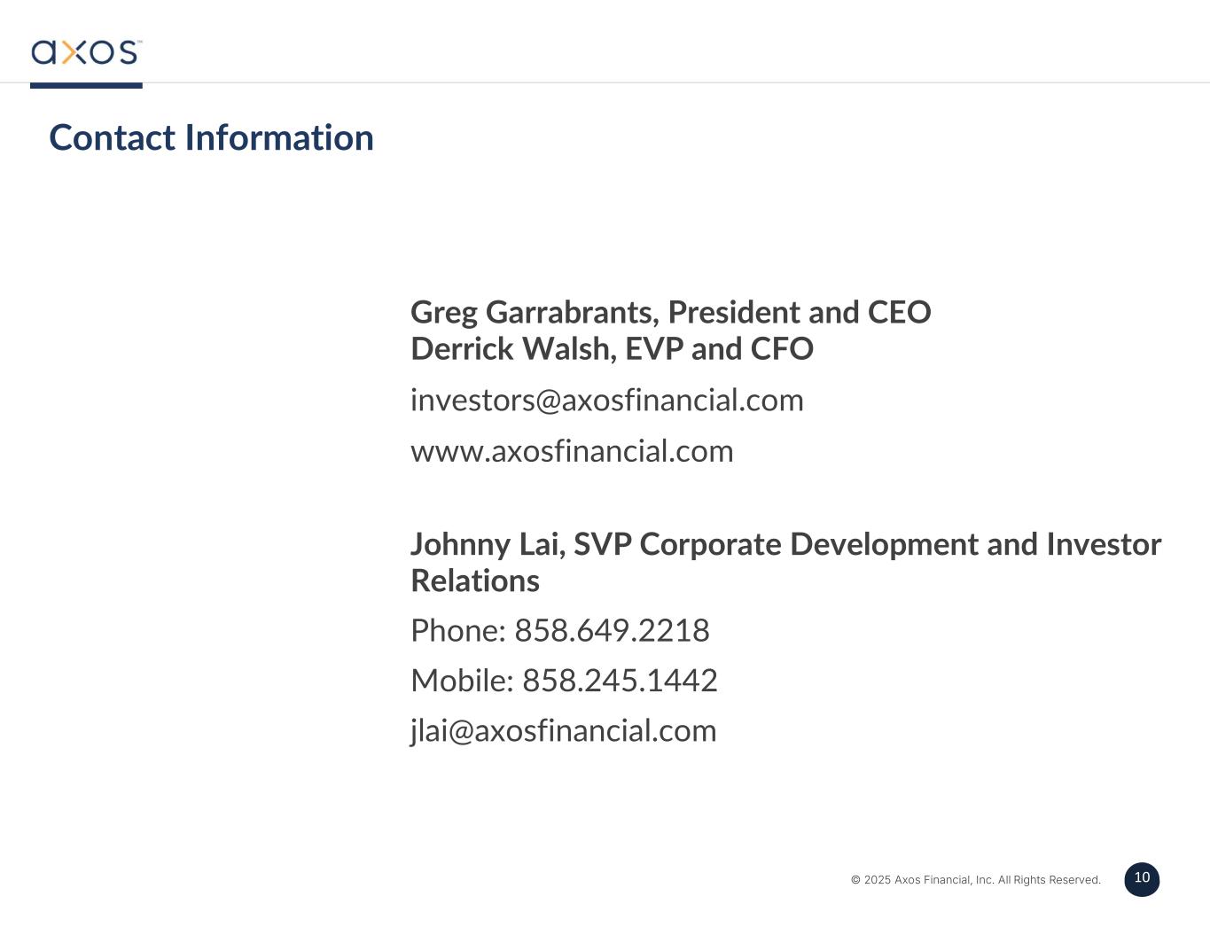 9 © 2025 Axos Financial, Inc. All Rights Reserved. 9 December 31, 2024 March 31, 2025 June 30, 2025 September 30, 2025 December 31, 2025(Dollars in thousands, except per share amounts) $ 104,687$ 105,206$ 110,675$ 112,352$ 128,397Net income 1,6451,6041,6042,9412,419Acquisition-related costs1 ———7,765—Verdant acquisition - Provision for credit losses —(1,879)———Other costs2 (503)80(465)(2,681)(649)Income taxes $ 105,829$ 105,011$ 111,814$ 120,377$ 130,167Adjusted earnings (non-GAAP) 58,226,00658,174,69657,558,28057,782,82857,731,339Average dilutive common shares outstanding $ 1.80$ 1.81$ 1.92$ 1.94$ 2.22Diluted EPS 0.030.030.030.050.04Acquisition-related costs1 ———0.13—Verdant acquisition - Provision for credit losses —(0.03)———Other costs2 (0.01)—(0.01)(0.05)(0.01)Income taxes $ 1.82$ 1.81$ 1.94$ 2.07$ 2.25Adjusted EPS (Non-GAAP) 1 Acquisition-related costs includes amortization of intangible assets, and for the three months ended September 30, 2025, also includes $1.3 million of acquisition-related costs associated with the Verdant acquisition. 2 Other costs for the three months ended March 31, 2025, primarily reflects the payment of a legal judgment at an amount less than previously accrued. We define “tangible book value”, a non-GAAP financial measure, as book value adjusted for goodwill and other intangible assets. Tangible book value is calculated using common stockholders’ equity minus servicing rights, goodwill and other intangible assets. Tangible book value per common share, a non-GAAP financial measure, is calculated by dividing tangible book value by the common shares outstanding at the end of the period. We believe tangible book value per common share is useful in evaluating the Company’s capital strength, financial condition, and ability to manage potential losses. Below is a reconciliation of total stockholders’ equity, the nearest comparable GAAP measure, to tangible book value per common share (non-GAAP) as of the dates indicated: December 31, 2024 March 31, 2025 June 30, 2025 September 30, 2025 December 31, 2025(Dollars in thousands, except per share amounts) $ 2,521,962$ 2,603,900$ 2,680,677$ 2,793,121$ 2,930,092Common stockholders’ equity 28,04527,58527,21826,24325,431Less: servicing rights, carried at fair value 137,570135,966134,502205,747196,119Less: goodwill and intangible assets $ 2,356,347$ 2,440,349$ 2,518,957$ 2,561,131$ 2,708,542Tangible common stockholders’ equity (Non-GAAP) 57,097,63256,865,52456,483,61756,643,54756,677,323Common shares outstanding at end of period $ 44.17$ 45.79$ 47.46$ 49.31$ 51.70Book value per common share $ 0.49$ 0.49$ 0.48$ 0.46$ 0.45Less: servicing rights, carried at fair value per common share $ 2.41$ 2.39$ 2.38$ 3.63$ 3.46Less: goodwill and other intangible assets per common share $ 41.27$ 42.91$ 44.60$ 45.22$ 47.79Tangible book value per common share (Non-GAAP) In addition to the results presented in accordance with GAAP, this earnings supplement includes non-GAAP financial measures such as adjusted earnings, adjusted earnings per diluted common share, and tangible book value per common share. Non-GAAP financial measures have inherent limitations, may not be comparable to similarly titled measures used by other companies and are not audited. Readers should be aware of these limitations and should be cautious as to their reliance on such measures. Although we believe the non-GAAP financial measures disclosed in this report enhance investors’ understanding of our business and performance, these non-GAAP measures should not be considered in isolation, or as a substitute for GAAP basis financial measures. We define “adjusted earnings”, a non-GAAP financial measure, as net income without the after-tax impact of non-recurring acquisition-related costs and other costs (unusual or non-recurring charges). Adjusted earnings per diluted common share (“adjusted EPS”), a non-GAAP financial measure, is calculated by dividing non-GAAP adjusted earnings by the average number of diluted common shares outstanding during the period. We believe the non-GAAP measures of adjusted earnings and adjusted EPS provide useful information about the Company’s operating performance. We believe excluding the non-recurring acquisition related costs and other costs (unusual or non-recurring) provides investors with an alternative understanding of Axos’ core business. Below is a reconciliation of net income, the nearest comparable GAAP measure, to adjusted earnings and adjusted EPS (Non-GAAP) for the periods shown: Use of Non-GAAP Financial Measures