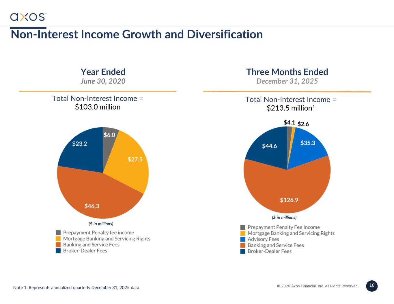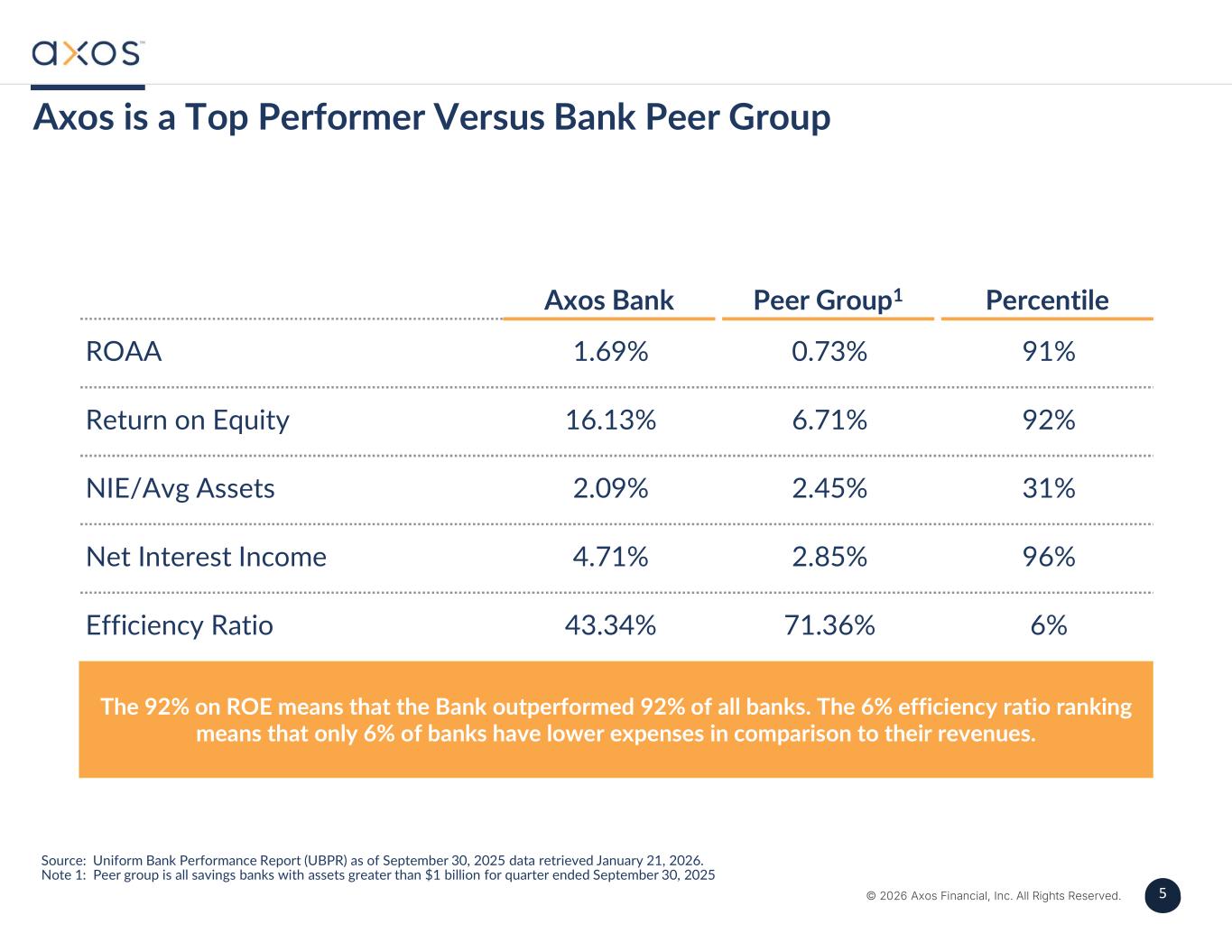 4 © 2026 Axos Financial, Inc. All Rights Reserved. 4 SecuritiesCommercial BankingConsumer Banking › Margin Lending › Securities Lending › SBLOCs › Asset-Based Lending › C&I Lending › Commercial Real Estate Specialty Lending › Equipment Finance › Fund Finance › Lender Finance › Multifamily › Auto Lending › Single-Family Mortgages › Personal Unsecured Lending › Cash Sweeps › Money Market › Cash and Treasury Management › HOA › Axos Fiduciary Services › Business Management › Payment Processing › Checking › Savings › Money Market › CDs › Bundled Products Deposits › Clearing Fees › Custody Fees › Mutual Fund/ETF Fees › Commissions › Investment Management Fees › Banking Fees › FX › Prepayment Fees › Operating Lease Income › Unused Line of Credit Fees › Mortgage BankingFee Income › Liberty › Axos Professional Workstation (APW) › ACE (Cash and TM) › Zenith (Business Management) › Unity (Fiduciary Services) › Universal Digital BankTechnology Diversified Sources of Lending, Deposits and Fee Income