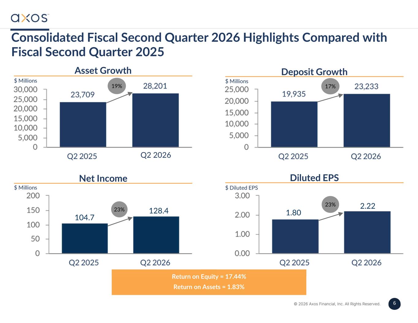 6 © 2026 Axos Financial, Inc. All Rights Reserved. 6 Return on Equity = 17.44% Return on Assets = 1.83% Consolidated Fiscal Second Quarter 2026 Highlights Compared with Fiscal Second Quarter 2025 19% 17% 23% 23% Asset Growth Deposit Growth Net Income Diluted EPS $ Millions $ Millions $ Millions $ Diluted EPS Q2 2026 128.4 2.22 104.7 1.80