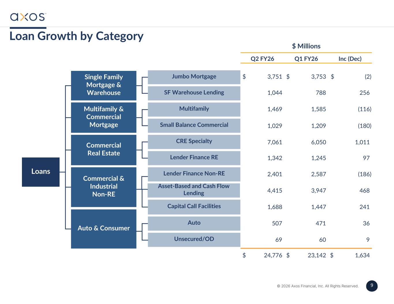 9 © 2026 Axos Financial, Inc. All Rights Reserved. 9 Loan Growth by Category $ Millions SF Warehouse Lending Multifamily Small Balance Commercial Jumbo Mortgage Lender Finance Non-RE Capital Call Facilities Auto Unsecured/OD Single Family Mortgage & Warehouse Multifamily & Commercial Mortgage Commercial Real Estate Commercial & Industrial Non-RE Loans Inc (Dec)Q1 FY26Q2 FY26 $ (2)$ 3,753$ 3,751 2567881,044 (116)1,5851,469 (180)1,2091,029 1,0116,0507,061 971,2451,342 (186)2,5872,401 4683,9474,415 2411,4471,688 36471507 96069 $ 1,634$ 23,142$ 24,776 Lender Finance RE CRE Specialty Auto & Consumer Asset-Based and Cash Flow Lending