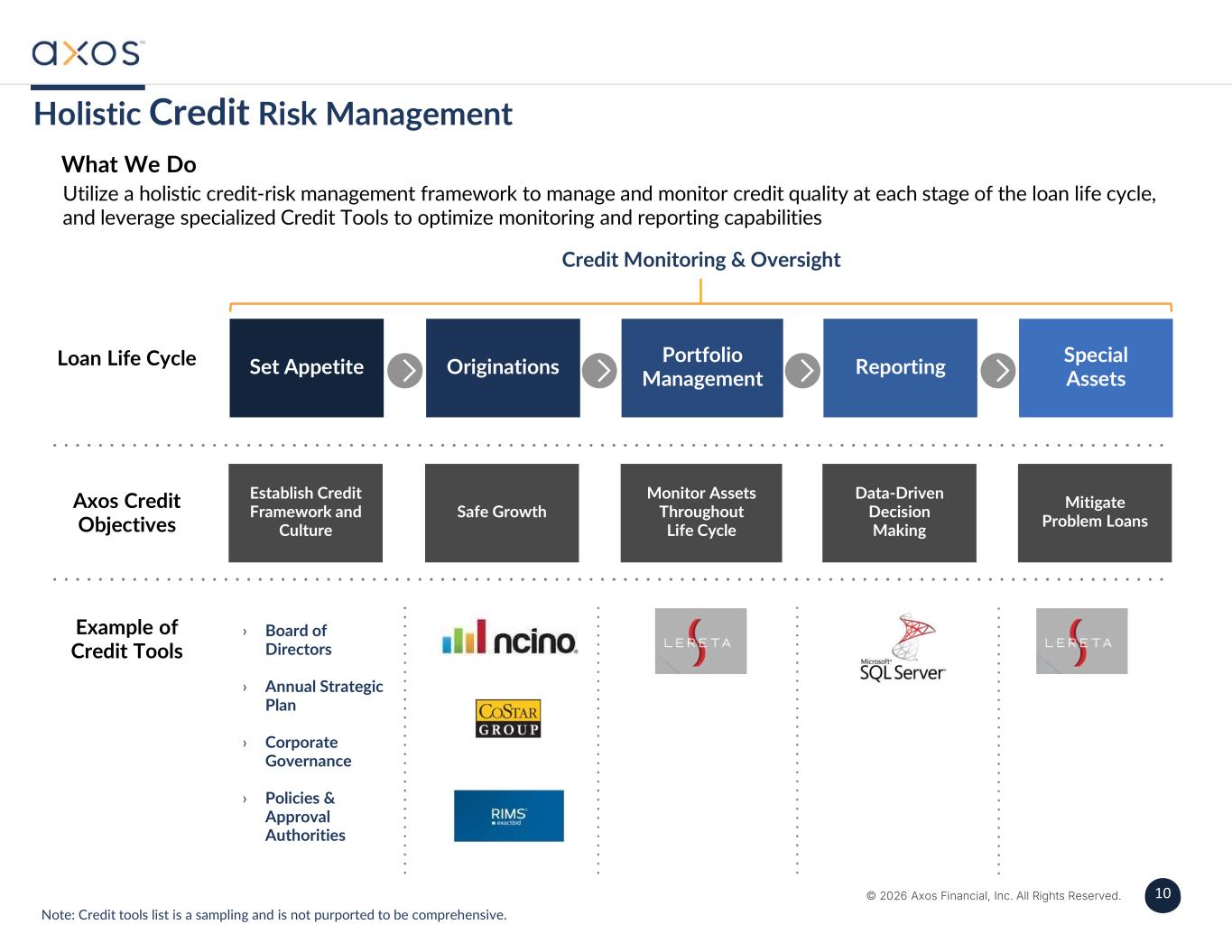 10 © 2026 Axos Financial, Inc. All Rights Reserved. 10 Holistic Credit Risk Management What We Do Loan Life Cycle Utilize a holistic credit-risk management framework to manage and monitor credit quality at each stage of the loan life cycle, and leverage specialized Credit Tools to optimize monitoring and reporting capabilities Set Appetite Originations Portfolio Management Reporting Special Assets Credit Monitoring & Oversight Axos Credit Objectives Example of Credit Tools › Board of Directors › Annual Strategic Plan › Corporate Governance › Policies & Approval Authorities Note: Credit tools list is a sampling and is not purported to be comprehensive. Establish Credit Framework and Culture Safe Growth Monitor Assets Throughout Life Cycle Data-Driven Decision Making Mitigate Problem Loans   