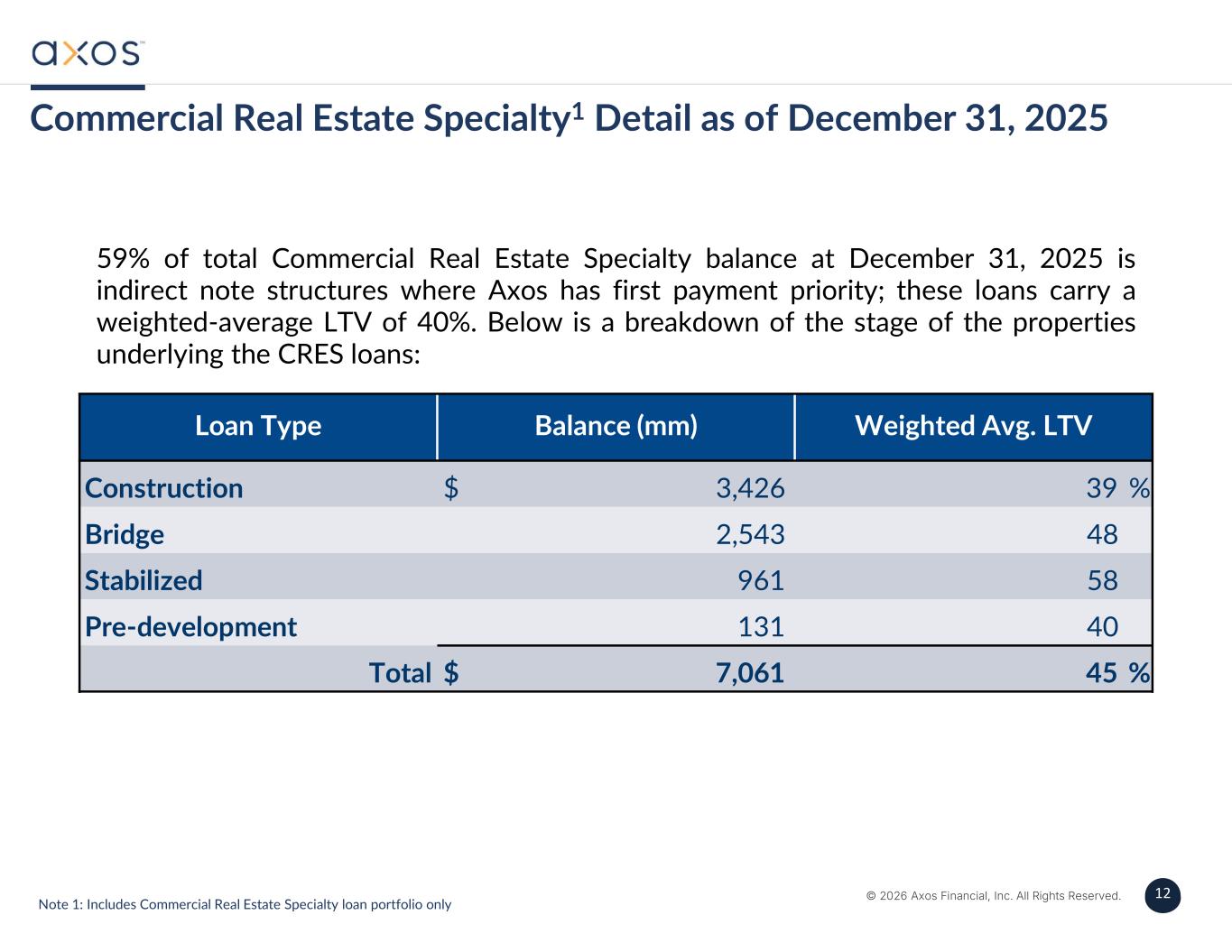 12 © 2026 Axos Financial, Inc. All Rights Reserved. 12 Commercial Real Estate Specialty1 Detail as of December 31, 2025 59% of total Commercial Real Estate Specialty balance at December 31, 2025 is indirect note structures where Axos has first payment priority; these loans carry a weighted-average LTV of 40%. Below is a breakdown of the stage of the properties underlying the CRES loans: Note 1: Includes Commercial Real Estate Specialty loan portfolio only Weighted Avg. LTVBalance (mm)Loan Type 39 %$ 3,426Construction 482,543Bridge 58961Stabilized 40131Pre-development 45 %$ 7,061Total