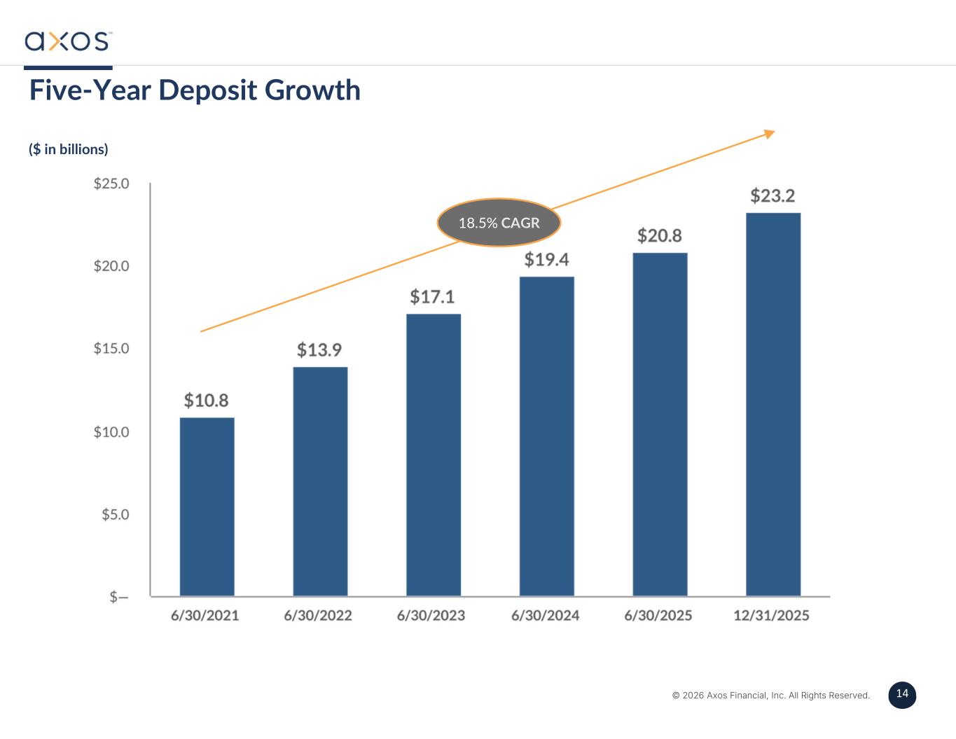 14 © 2026 Axos Financial, Inc. All Rights Reserved. 14 Five-Year Deposit Growth ($ in billions) 18.5% CAGR