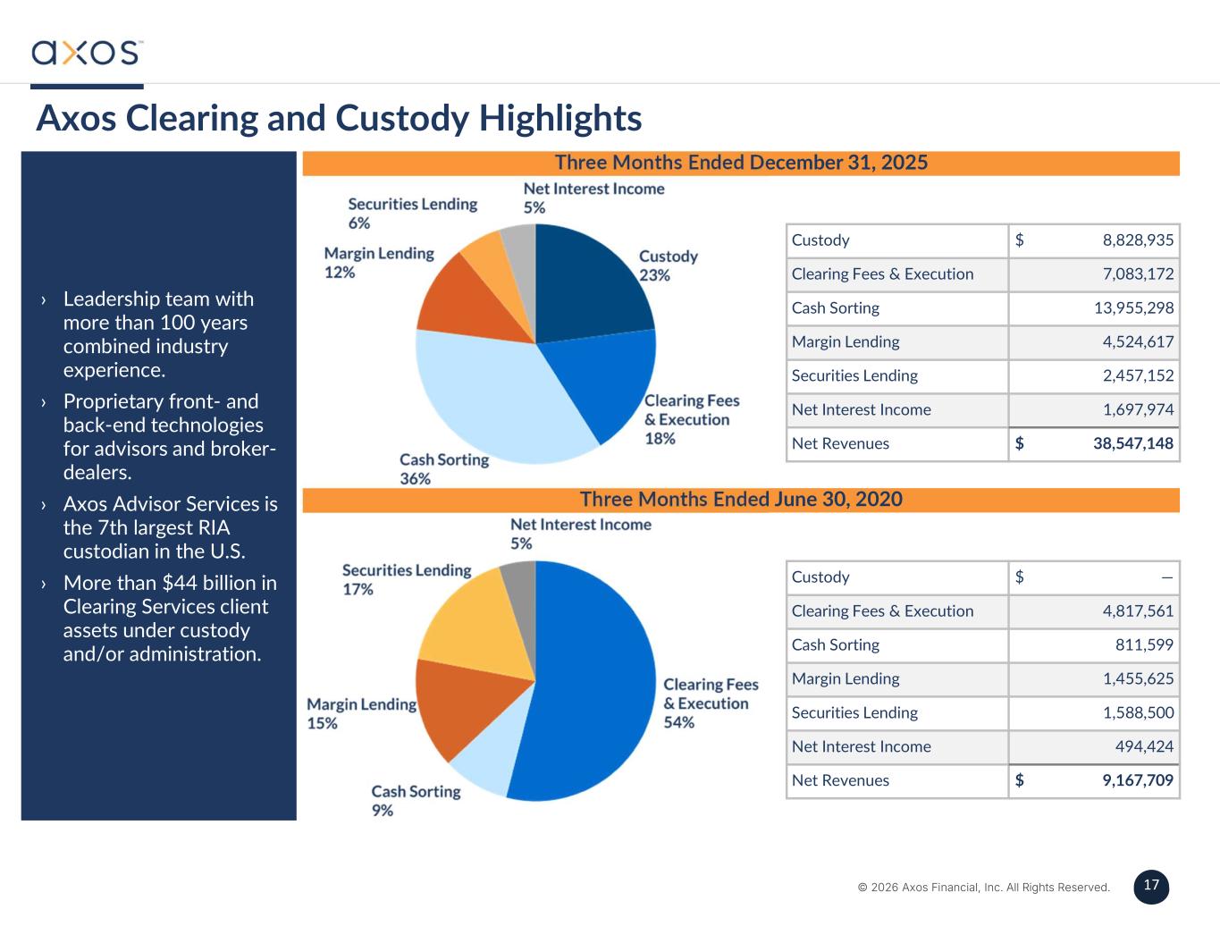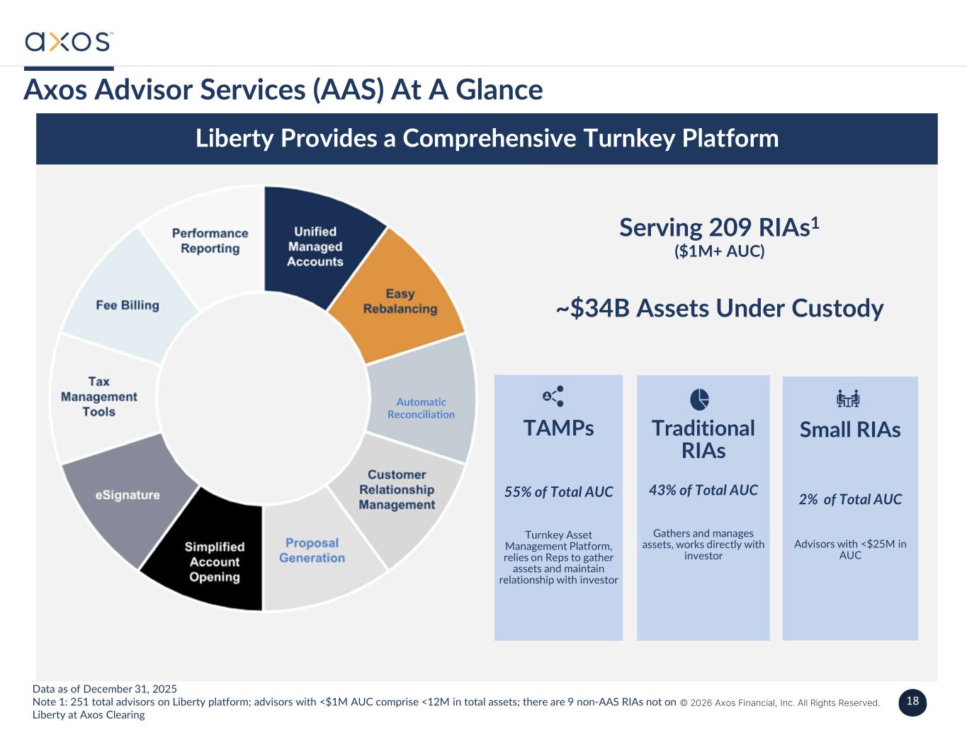 17 © 2026 Axos Financial, Inc. All Rights Reserved. 17 › Leadership team with more than 100 years combined industry experience. › Proprietary front- and back-end technologies for advisors and broker- dealers. › Axos Advisor Services is the 7th largest RIA custodian in the U.S. › More than $44 billion in Clearing Services client assets under custody and/or administration. Three Months Ended December 31, 2025 Three Months Ended June 30, 2020 $ —Custody 4,817,561Clearing Fees & Execution 811,599Cash Sorting 1,455,625Margin Lending 1,588,500Securities Lending 494,424Net Interest Income $ 9,167,709Net Revenues $ 8,828,935Custody 7,083,172Clearing Fees & Execution 13,955,298Cash Sorting 4,524,617Margin Lending 2,457,152Securities Lending 1,697,974Net Interest Income $ 38,547,148Net Revenues Axos Clearing and Custody Highlights