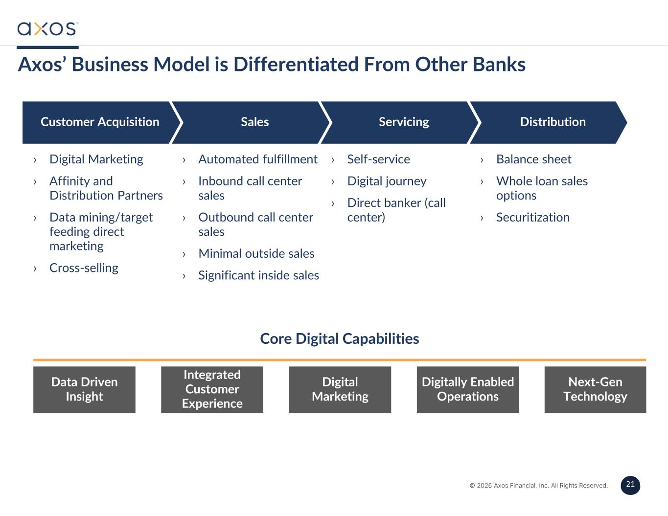 20 © 2026 Axos Financial, Inc. All Rights Reserved. 20 Axos Securities Roadmap FuturePresentPast 2026+2023 - 20252018 - 2022 • Learning new skills within the current business vertical (adaptable, siloed) People • Leveraging technology for efficiencies / outsourcing low value tasks (enhanced accuracy, better resource utilization) Processes • Home-grown bi-furcated technology (duplicative, confusing) Technology • Broad growth in competence and knowledge (Collaborative, Aligned, Client-Centric) People • Digital transformation that drives automation and scalability (Data- driven, AI, Machine Learning, Agile) Processes • Entitlement-based single pane of glass tech & open architecture data solution(s) meet clients where they are at (Innovative, Differentiated, Flexible) Technology • Highly skilled in the business segment(s) being served (Uncertainty, frustration) People • Operational inefficiencies (high cost, inflexible) Processes • Closed ecosystem technology and dependent on 3rd party solutions Technology Leverage expertise and technologies in clearing and custody to serve a broader client base