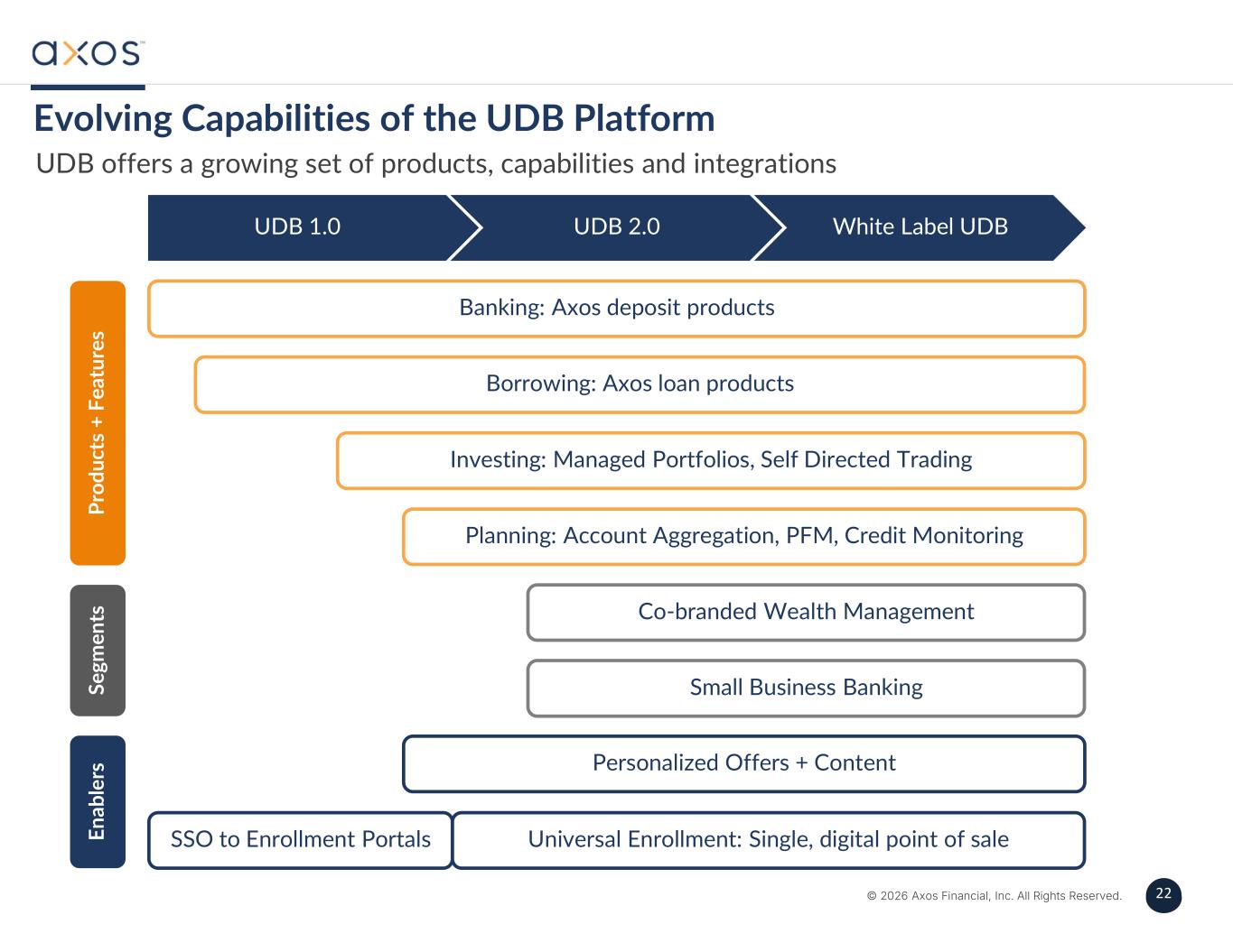 21 © 2026 Axos Financial, Inc. All Rights Reserved. 21 Customer Acquisition Sales Servicing Distribution › Digital Marketing › Affinity and Distribution Partners › Data mining/target feeding direct marketing › Cross-selling › Automated fulfillment › Inbound call center sales › Outbound call center sales › Minimal outside sales › Significant inside sales › Self-service › Digital journey › Direct banker (call center) › Balance sheet › Whole loan sales options › Securitization Data Driven Insight Integrated Customer Experience Digital Marketing Digitally Enabled Operations Next-Gen Technology Core Digital Capabilities Axos’ Business Model is Differentiated From Other Banks