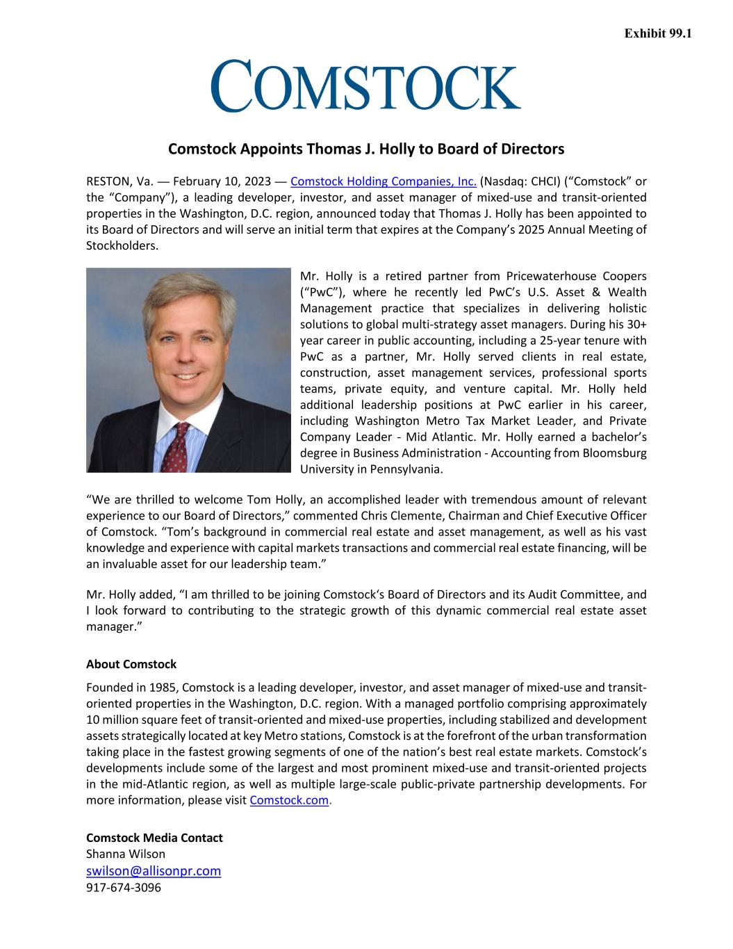 Comstock Appoints Thomas J. Holly to Board of Directors RESTON, Va. — February 10, 2023 — Comstock Holding Companies, Inc. (Nasdaq: CHCI) (“Comstock” or the “Company”), a leading developer, investor, and asset manager of mixed-use and transit-oriented properties in the Washington, D.C. region, announced today that Thomas J. Holly has been appointed to its Board of Directors and will serve an initial term that expires at the Company’s 2025 Annual Meeting of Stockholders. Mr. Holly is a retired partner from Pricewaterhouse Coopers (“PwC”), where he recently led PwC’s U.S. Asset & Wealth Management practice that specializes in delivering holistic solutions to global multi-strategy asset managers. During his 30+ year career in public accounting, including a 25-year tenure with PwC as a partner, Mr. Holly served clients in real estate, construction, asset management services, professional sports teams, private equity, and venture capital. Mr. Holly held additional leadership positions at PwC earlier in his career, including Washington Metro Tax Market Leader, and Private Company Leader - Mid Atlantic. Mr. Holly earned a bachelor’s degree in Business Administration - Accounting from Bloomsburg University in Pennsylvania. “We are thrilled to welcome Tom Holly, an accomplished leader with tremendous amount of relevant experience to our Board of Directors,” commented Chris Clemente, Chairman and Chief Executive Officer of Comstock. “Tom’s background in commercial real estate and asset management, as well as his vast knowledge and experience with capital markets transactions and commercial real estate financing, will be an invaluable asset for our leadership team.” Mr. Holly added, “I am thrilled to be joining Comstock‘s Board of Directors and its Audit Committee, and I look forward to contributing to the strategic growth of this dynamic commercial real estate asset manager.” About Comstock Founded in 1985, Comstock is a leading developer, investor, and asset manager of mixed-use and transit- oriented properties in the Washington, D.C. region. With a managed portfolio comprising approximately 10 million square feet of transit-oriented and mixed-use properties, including stabilized and development assets strategically located at key Metro stations, Comstock is at the forefront of the urban transformation taking place in the fastest growing segments of one of the nation’s best real estate markets. Comstock’s developments include some of the largest and most prominent mixed-use and transit-oriented projects in the mid-Atlantic region, as well as multiple large-scale public-private partnership developments. For more information, please visit Comstock.com. Comstock Media Contact Shanna Wilson swilson@allisonpr.com 917-674-3096 Exhibit 99.1