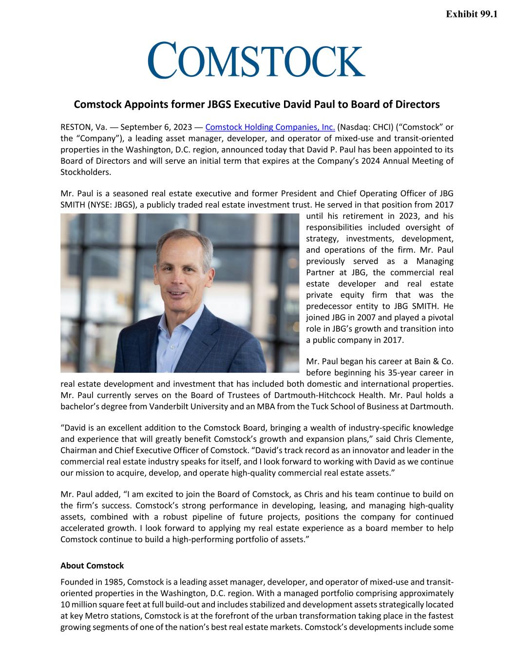 Comstock Appoints former JBGS Executive David Paul to Board of Directors RESTON, Va. — September 6, 2023 — Comstock Holding Companies, Inc. (Nasdaq: CHCI) (“Comstock” or the “Company”), a leading asset manager, developer, and operator of mixed-use and transit-oriented properties in the Washington, D.C. region, announced today that David P. Paul has been appointed to its Board of Directors and will serve an initial term that expires at the Company’s 2024 Annual Meeting of Stockholders. Mr. Paul is a seasoned real estate executive and former President and Chief Operating Officer of JBG SMITH (NYSE: JBGS), a publicly traded real estate investment trust. He served in that position from 2017 until his retirement in 2023, and his responsibilities included oversight of strategy, investments, development, and operations of the firm. Mr. Paul previously served as a Managing Partner at JBG, the commercial real estate developer and real estate private equity firm that was the predecessor entity to JBG SMITH. He joined JBG in 2007 and played a pivotal role in JBG’s growth and transition into a public company in 2017. Mr. Paul began his career at Bain & Co. before beginning his 35-year career in real estate development and investment that has included both domestic and international properties. Mr. Paul currently serves on the Board of Trustees of Dartmouth-Hitchcock Health. Mr. Paul holds a bachelor’s degree from Vanderbilt University and an MBA from the Tuck School of Business at Dartmouth. “David is an excellent addition to the Comstock Board, bringing a wealth of industry-specific knowledge and experience that will greatly benefit Comstock’s growth and expansion plans,” said Chris Clemente, Chairman and Chief Executive Officer of Comstock. “David’s track record as an innovator and leader in the commercial real estate industry speaks for itself, and I look forward to working with David as we continue our mission to acquire, develop, and operate high-quality commercial real estate assets.” Mr. Paul added, “I am excited to join the Board of Comstock, as Chris and his team continue to build on the firm’s success. Comstock’s strong performance in developing, leasing, and managing high-quality assets, combined with a robust pipeline of future projects, positions the company for continued accelerated growth. I look forward to applying my real estate experience as a board member to help Comstock continue to build a high-performing portfolio of assets.” About Comstock Founded in 1985, Comstock is a leading asset manager, developer, and operator of mixed-use and transit- oriented properties in the Washington, D.C. region. With a managed portfolio comprising approximately 10 million square feet at full build-out and includes stabilized and development assets strategically located at key Metro stations, Comstock is at the forefront of the urban transformation taking place in the fastest growing segments of one of the nation’s best real estate markets. Comstock’s developments include some Exhibit 99.1