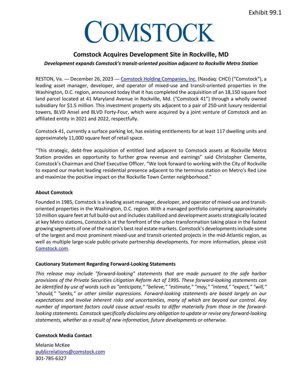 Comstock Acquires Development Site in Rockville, MD Development expands Comstock’s transit-oriented position adjacent to Rockville Metro Station RESTON, Va. — December 26, 2023 — Comstock Holding Companies, Inc. (Nasdaq: CHCI) (“Comstock”), a leading asset manager, developer, and operator of mixed-use and transit-oriented properties in the Washington, D.C. region, announced today that it has completed the acquisition of an 18,150 square foot land parcel located at 41 Maryland Avenue in Rockville, Md. (“Comstock 41”) through a wholly owned subsidiary for $1.5 million. This investment property sits adjacent to a pair of 250-unit luxury residential towers, BLVD Ansel and BLVD Forty-Four, which were acquired by a joint venture of Comstock and an affiliated entity in 2021 and 2022, respectfully. Comstock 41, currently a surface parking lot, has existing entitlements for at least 117 dwelling units and approximately 11,000 square feet of retail space. “This strategic, debt-free acquisition of entitled land adjacent to Comstock assets at Rockville Metro Station provides an opportunity to further grow revenue and earnings” said Christopher Clemente, Comstock’s Chairman and Chief Executive Officer. “We look forward to working with the City of Rockville to expand our market leading residential presence adjacent to the terminus station on Metro’s Red Line and maximize the positive impact on the Rockville Town Center neighborhood.” About Comstock Founded in 1985, Comstock is a leading asset manager, developer, and operator of mixed-use and transit- oriented properties in the Washington, D.C. region. With a managed portfolio comprising approximately 10 million square feet at full build-out and includes stabilized and development assets strategically located at key Metro stations, Comstock is at the forefront of the urban transformation taking place in the fastest growing segments of one of the nation’s best real estate markets. Comstock’s developments include some of the largest and most prominent mixed-use and transit-oriented projects in the mid-Atlantic region, as well as multiple large-scale public-private partnership developments. For more information, please visit Comstock.com. Cautionary Statement Regarding Forward-Looking Statements This release may include "forward-looking" statements that are made pursuant to the safe harbor provisions of the Private Securities Litigation Reform Act of 1995. These forward-looking statements can be identified by use of words such as "anticipate," "believe," "estimate," "may," "intend," "expect," "will," "should," "seeks," or other similar expressions. Forward-looking statements are based largely on our expectations and involve inherent risks and uncertainties, many of which are beyond our control. Any number of important factors could cause actual results to differ materially from those in the forward- looking statements. Comstock specifically disclaims any obligation to update or revise any forward-looking statements, whether as a result of new information, future developments or otherwise. Comstock Media Contact Melanie McKee publicrelations@comstock.com 301-785-6327 Exhibit 99.1