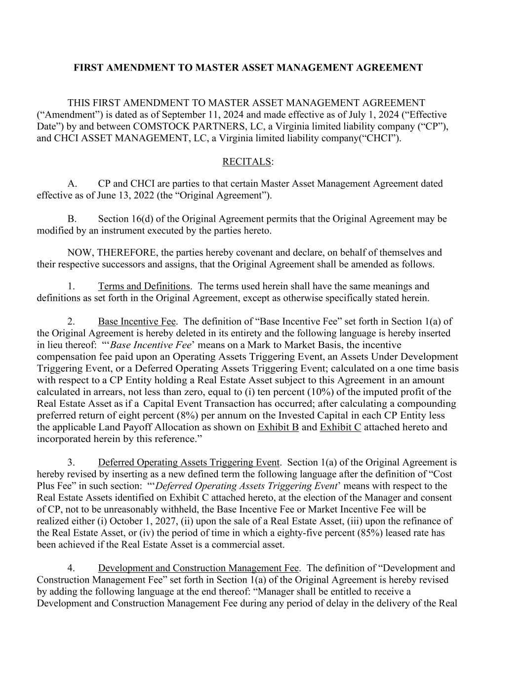 FIRST AMENDMENT TO MASTER ASSET MANAGEMENT AGREEMENT THIS FIRST AMENDMENT TO MASTER ASSET MANAGEMENT AGREEMENT (“Amendment”) is dated as of September 11, 2024 and made effective as of July 1, 2024 (“Effective Date”) by and between COMSTOCK PARTNERS, LC, a Virginia limited liability company (“CP”), and CHCI ASSET MANAGEMENT, LC, a Virginia limited liability company(“CHCI”). RECITALS: A. CP and CHCI are parties to that certain Master Asset Management Agreement dated effective as of June 13, 2022 (the “Original Agreement”). B. Section 16(d) of the Original Agreement permits that the Original Agreement may be modified by an instrument executed by the parties hereto. NOW, THEREFORE, the parties hereby covenant and declare, on behalf of themselves and their respective successors and assigns, that the Original Agreement shall be amended as follows. 1. Terms and Definitions. The terms used herein shall have the same meanings and definitions as set forth in the Original Agreement, except as otherwise specifically stated herein. 2. Base Incentive Fee. The definition of “Base Incentive Fee” set forth in Section 1(a) of the Original Agreement is hereby deleted in its entirety and the following language is hereby inserted in lieu thereof: “‘Base Incentive Fee’ means on a Mark to Market Basis, the incentive compensation fee paid upon an Operating Assets Triggering Event, an Assets Under Development Triggering Event, or a Deferred Operating Assets Triggering Event; calculated on a one time basis with respect to a CP Entity holding a Real Estate Asset subject to this Agreement in an amount calculated in arrears, not less than zero, equal to (i) ten percent (10%) of the imputed profit of the Real Estate Asset as if a Capital Event Transaction has occurred; after calculating a compounding preferred return of eight percent (8%) per annum on the Invested Capital in each CP Entity less the applicable Land Payoff Allocation as shown on Exhibit B and Exhibit C attached hereto and incorporated herein by this reference.” 3. Deferred Operating Assets Triggering Event. Section 1(a) of the Original Agreement is hereby revised by inserting as a new defined term the following language after the definition of “Cost Plus Fee” in such section: “‘Deferred Operating Assets Triggering Event’ means with respect to the Real Estate Assets identified on Exhibit C attached hereto, at the election of the Manager and consent of CP, not to be unreasonably withheld, the Base Incentive Fee or Market Incentive Fee will be realized either (i) October 1, 2027, (ii) upon the sale of a Real Estate Asset, (iii) upon the refinance of the Real Estate Asset, or (iv) the period of time in which a eighty-five percent (85%) leased rate has been achieved if the Real Estate Asset is a commercial asset. 4. Development and Construction Management Fee. The definition of “Development and Construction Management Fee” set forth in Section 1(a) of the Original Agreement is hereby revised by adding the following language at the end thereof: “Manager shall be entitled to receive a Development and Construction Management Fee during any period of delay in the delivery of the Real
