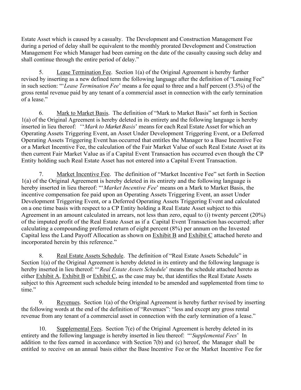 Estate Asset which is caused by a casualty. The Development and Construction Management Fee during a period of delay shall be equivalent to the monthly prorated Development and Construction Management Fee which Manager had been earning on the date of the casualty causing such delay and shall continue through the entire period of delay.” 5. Lease Termination Fee. Section 1(a) of the Original Agreement is hereby further revised by inserting as a new defined term the following language after the definition of “Leasing Fee” in such section: “‘Lease Termination Fee’ means a fee equal to three and a half percent (3.5%) of the gross rental revenue paid by any tenant of a commercial asset in connection with the early termination of a lease.” 6. Mark to Market Basis. The definition of “Mark to Market Basis” set forth in Section 1(a) of the Original Agreement is hereby deleted in its entirety and the following language is hereby inserted in lieu thereof: “‘Mark to Market Basis’ means for each Real Estate Asset for which an Operating Assets Triggering Event, an Asset Under Development Triggering Event, or a Deferred Operating Assets Triggering Event has occurred that entitles the Manager to a Base Incentive Fee or a Market Incentive Fee, the calculation of the Fair Market Value of such Real Estate Asset at its then current Fair Market Value as if a Capital Event Transaction has occurred even though the CP Entity holding such Real Estate Asset has not entered into a Capital Event Transaction. 7. Market Incentive Fee. The definition of “Market Incentive Fee” set forth in Section 1(a) of the Original Agreement is hereby deleted in its entirety and the following language is hereby inserted in lieu thereof: “‘Market Incentive Fee’ means on a Mark to Market Basis, the incentive compensation fee paid upon an Operating Assets Triggering Event, an asset Under Development Triggering Event, or a Deferred Operating Assets Triggering Event and calculated on a one time basis with respect to a CP Entity holding a Real Estate Asset subject to this Agreement in an amount calculated in arrears, not less than zero, equal to (i) twenty percent (20%) of the imputed profit of the Real Estate Asset as if a Capital Event Transaction has occurred; after calculating a compounding preferred return of eight percent (8%) per annum on the Invested Capital less the Land Payoff Allocation as shown on Exhibit B and Exhibit C attached hereto and incorporated herein by this reference.” 8. Real Estate Assets Schedule. The definition of “Real Estate Assets Schedule” in Section 1(a) of the Original Agreement is hereby deleted in its entirety and the following language is hereby inserted in lieu thereof: “‘Real Estate Assets Schedule’ means the schedule attached hereto as either Exhibit A, Exhibit B or Exhibit C, as the case may be, that identifies the Real Estate Assets subject to this Agreement such schedule being intended to be amended and supplemented from time to time.” 9. Revenues. Section 1(a) of the Original Agreement is hereby further revised by inserting the following words at the end of the definition of “Revenues”: “less and except any gross rental revenue from any tenant of a commercial asset in connection with the early termination of a lease.” 10. Supplemental Fees. Section 7(e) of the Original Agreement is hereby deleted in its entirety and the following language is hereby inserted in lieu thereof: “‘Supplemental Fees’ In addition to the fees earned in accordance with Section 7(b) and (c) hereof, the Manager shall be entitled to receive on an annual basis either the Base Incentive Fee or the Market Incentive Fee for