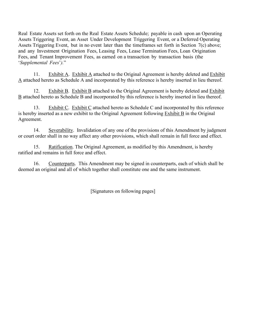 Real Estate Assets set forth on the Real Estate Assets Schedule; payable in cash upon an Operating Assets Triggering Event, an Asset Under Development Triggering Event, or a Deferred Operating Assets Triggering Event, but in no event later than the timeframes set forth in Section 7(c) above; and any Investment Origination Fees, Leasing Fees, Lease Termination Fees, Loan Origination Fees, and Tenant Improvement Fees, as earned on a transaction by transaction basis (the ‘Supplemental Fees’).” 11. Exhibit A. Exhibit A attached to the Original Agreement is hereby deleted and Exhibit A attached hereto as Schedule A and incorporated by this reference is hereby inserted in lieu thereof. 12. Exhibit B. Exhibit B attached to the Original Agreement is hereby deleted and Exhibit B attached hereto as Schedule B and incorporated by this reference is hereby inserted in lieu thereof. 13. Exhibit C. Exhibit C attached hereto as Schedule C and incorporated by this reference is hereby inserted as a new exhibit to the Original Agreement following Exhibit B in the Original Agreement. 14. Severability. Invalidation of any one of the provisions of this Amendment by judgment or court order shall in no way affect any other provisions, which shall remain in full force and effect. 15. Ratification. The Original Agreement, as modified by this Amendment, is hereby ratified and remains in full force and effect. 16. Counterparts. This Amendment may be signed in counterparts, each of which shall be deemed an original and all of which together shall constitute one and the same instrument. [Signatures on following pages]