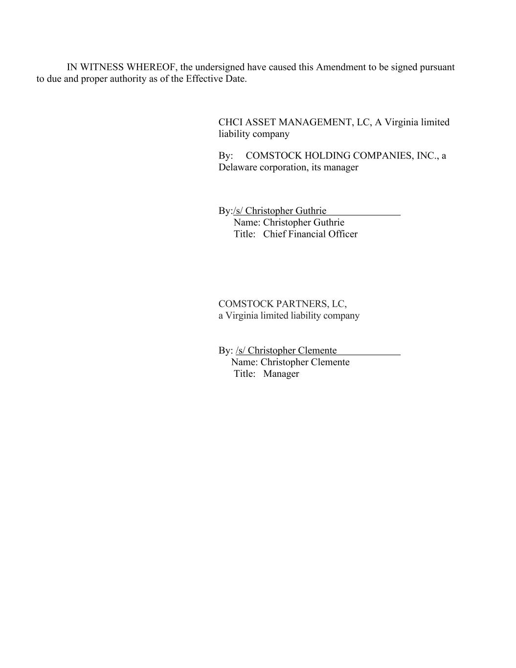 IN WITNESS WHEREOF, the undersigned have caused this Amendment to be signed pursuant to due and proper authority as of the Effective Date. CHCI ASSET MANAGEMENT, LC, A Virginia limited liability company By: COMSTOCK HOLDING COMPANIES, INC., a Delaware corporation, its manager By:/s/ Christopher Guthrie Name: Christopher Guthrie Title: Chief Financial Officer COMSTOCK PARTNERS, LC, a Virginia limited liability company By: /s/ Christopher Clemente Name: Christopher Clemente Title: Manager